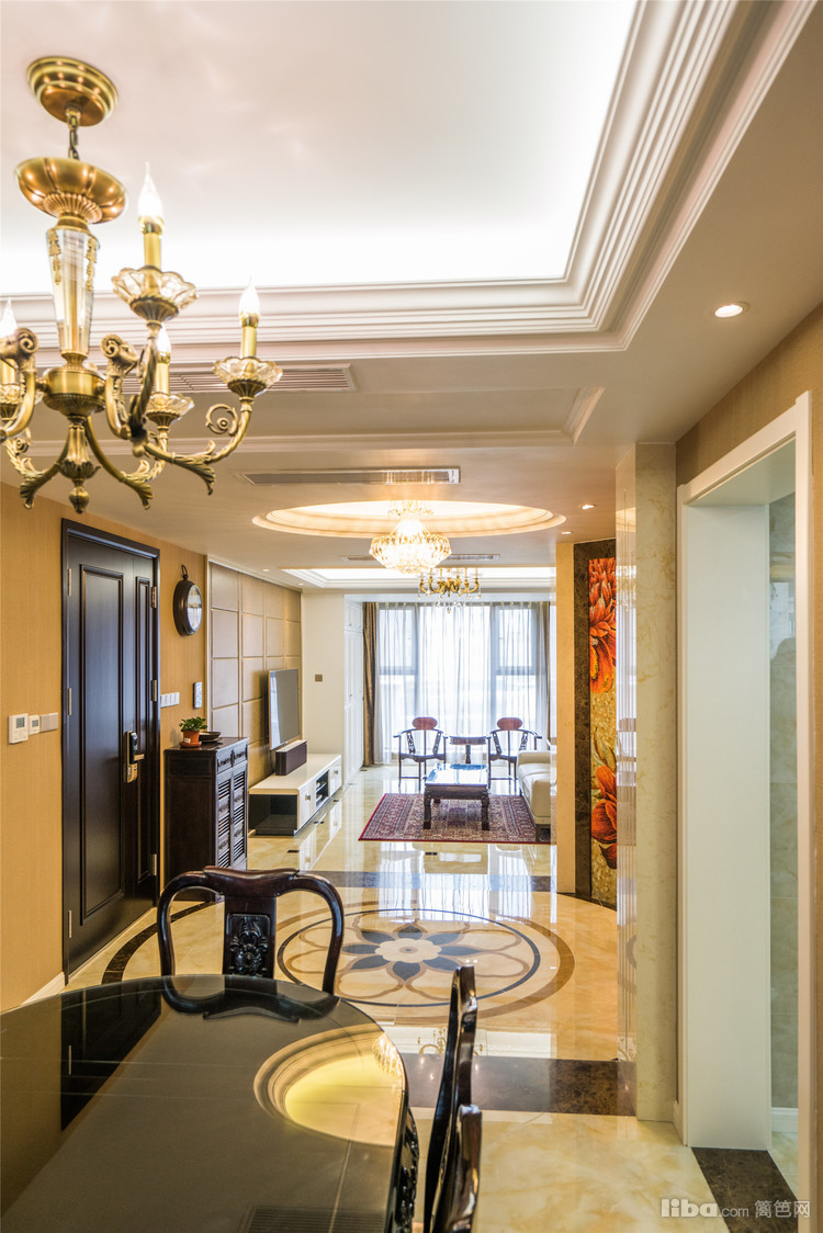 1.玄关区域进行了大幅改造,采用中国传统的照壁的设计手法,嵌入代表吉祥如意的五朵牡丹。