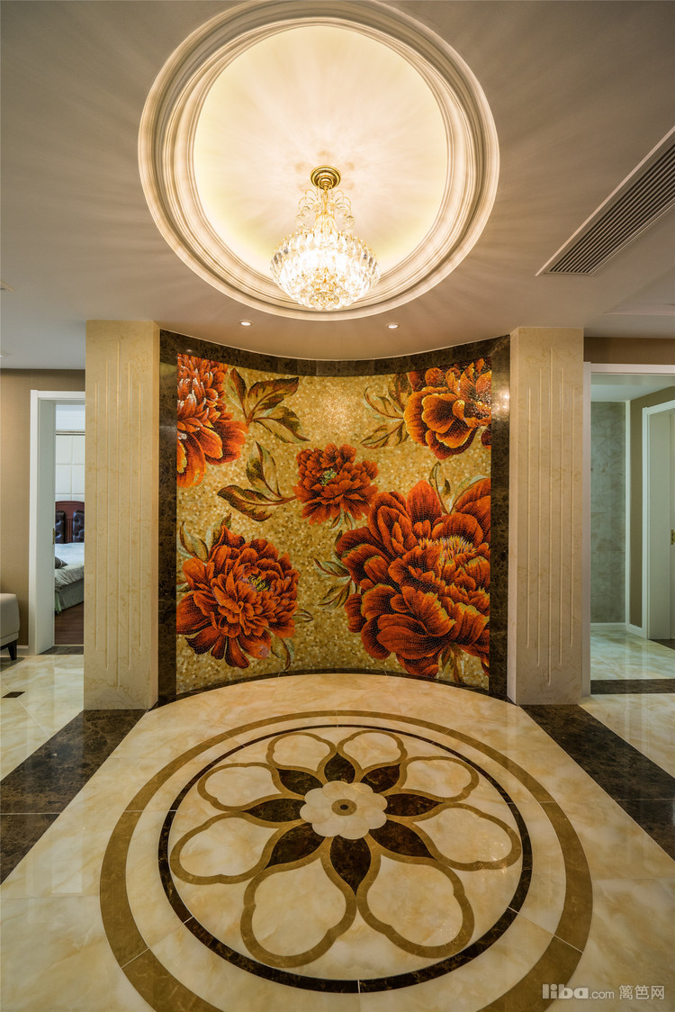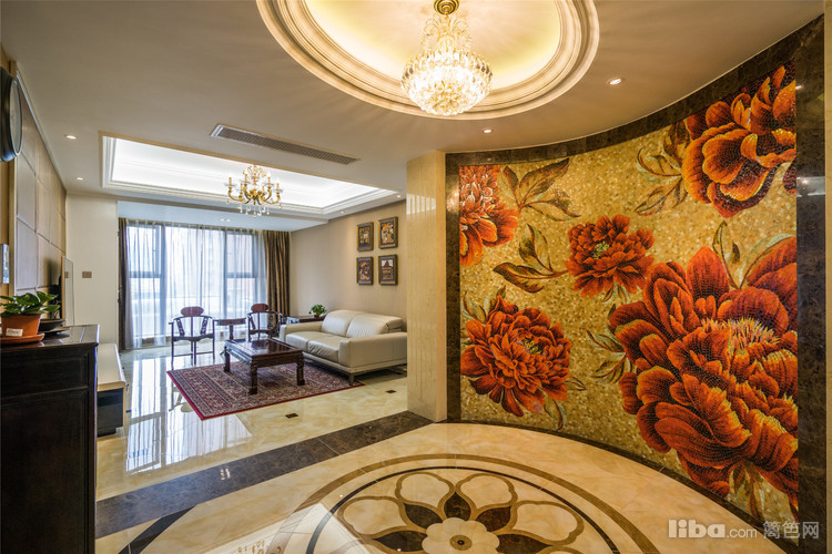 进门的玄关有着很强的视觉冲击感,一整面马赛克牡丹照壁,让人仿佛走进流光溢彩的盛世大唐。