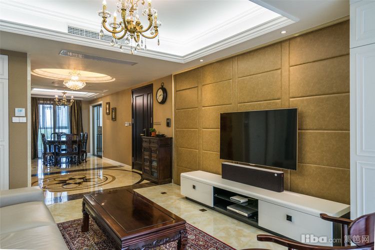 进门的玄关有着很强的视觉冲击感,一整面马赛克牡丹照壁,让人仿佛走进流光溢彩的盛世大唐。现代风格的皮质沙发与古典中式圈椅融合在淡雅的浅杏色空间主色调中,散发出安逸舒适的气息。