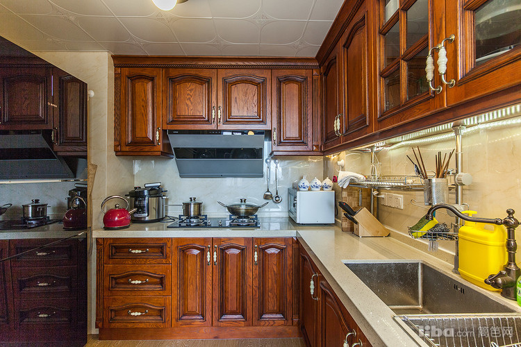 厨房依然选择了美式橱柜,色泽偏深,有利于打理卫生。抬高的操作柜考虑了人体工程学,也安置了洗衣机。