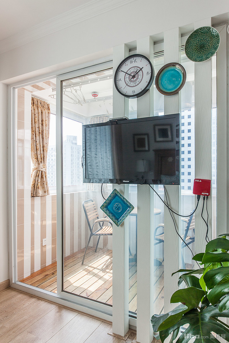 与阳台隔离的玻璃移门还兼作了电视墙的功能,空间利用率大幅提升实用性也得到了保障。