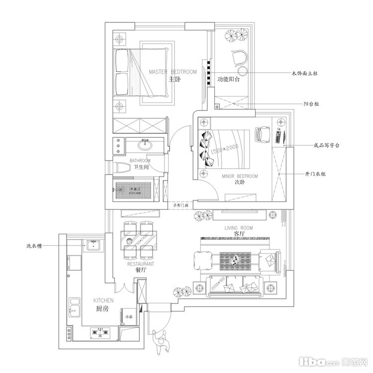 1.原来卫生间门处改为书柜,使走廊区充满文化氛围