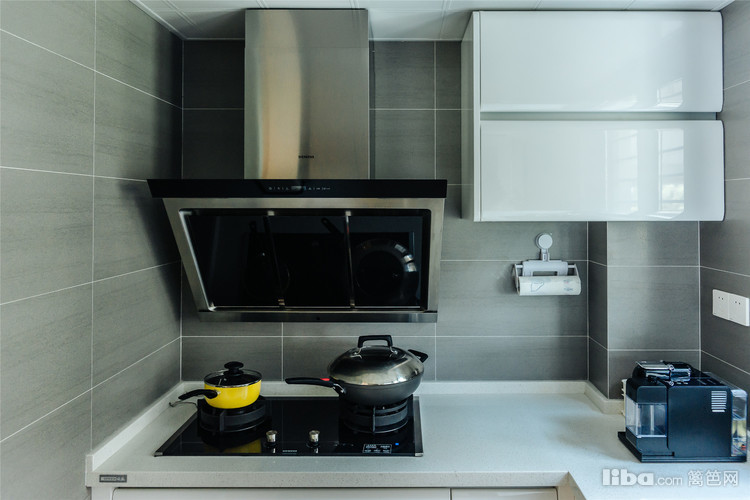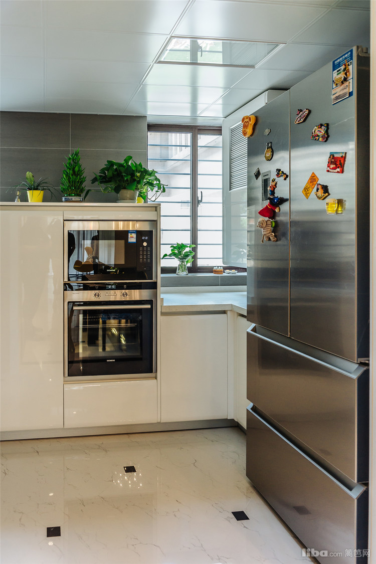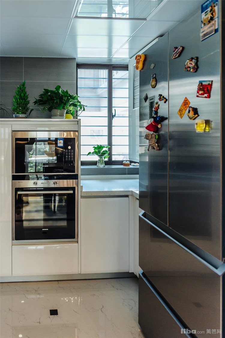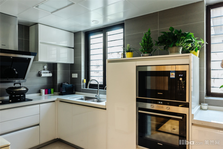 简约型线条的厨房,以干净的白色为主,灶台与西水盆相邻,方便烹饪,一旁的烤箱上有植物可以调节空气。