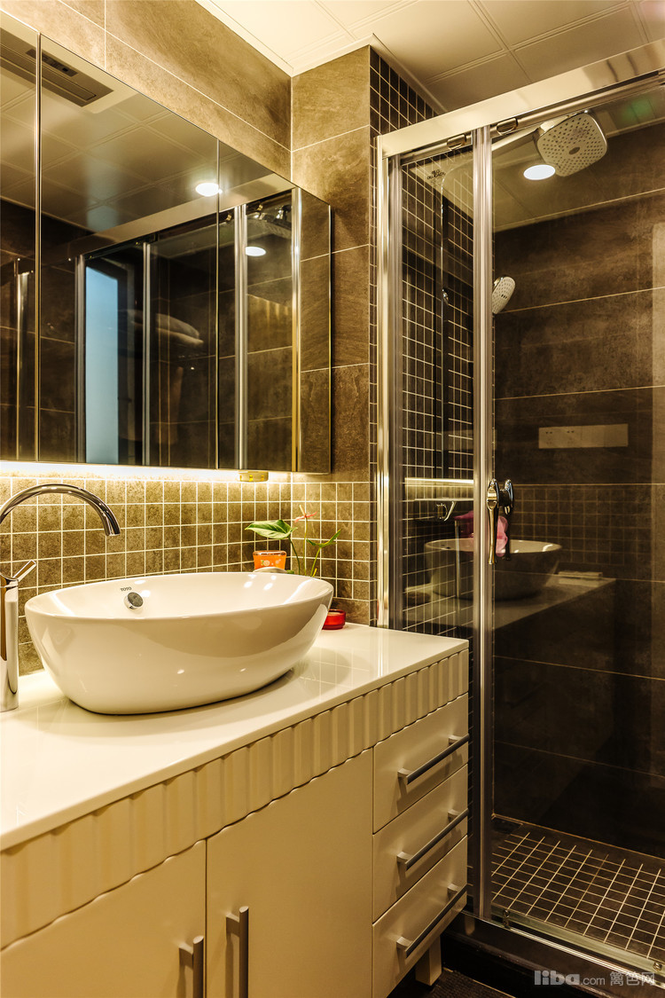 卫生间以深咖咖啡为主,采用整块横幅镜面,可以扩大视觉效果,洗脸盆是摆放式洗脸盆,简单大气。