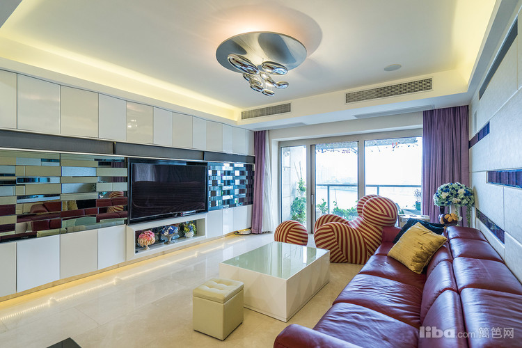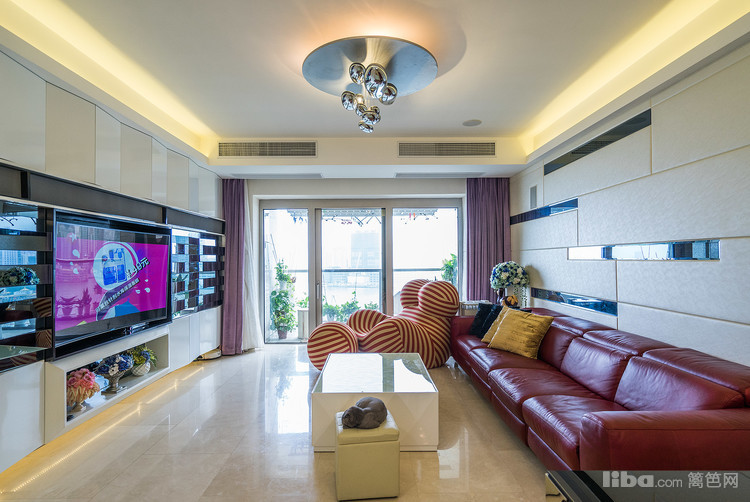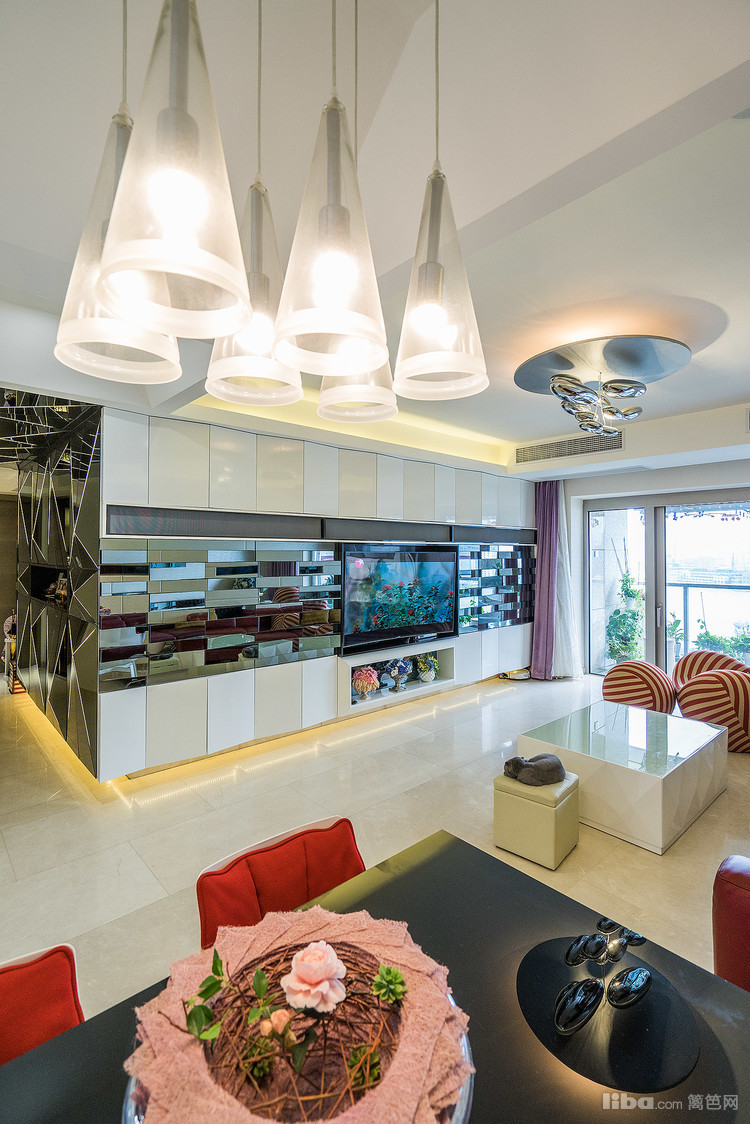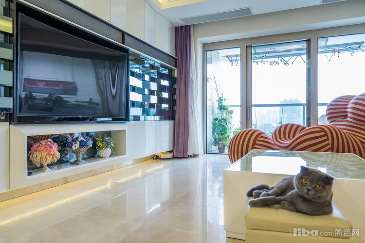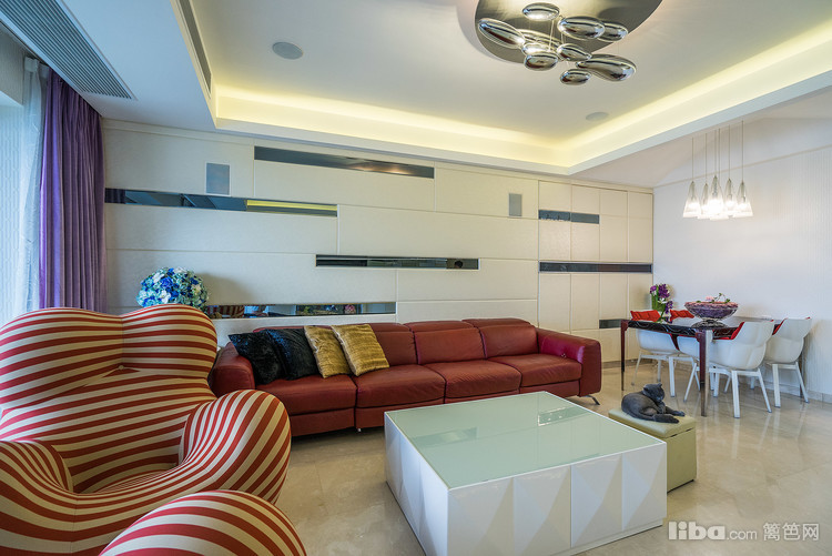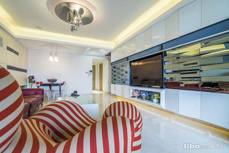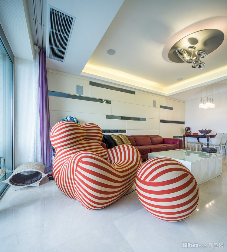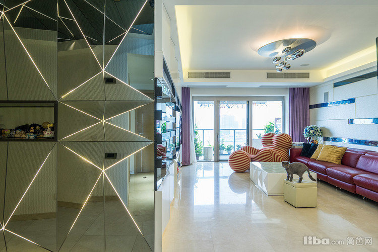 ART DECO风格的玄关转接了客厅的过度部分,客厅采光通透,面积宽敞,红白相间颜色对比强烈的布艺沙发十分抽象,别具一格。