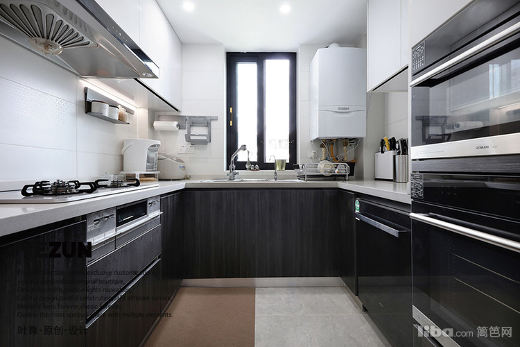 厨房:深色木纹的定制柜体经久耐看永不过时。为增加收纳分为上下两段式,但又保留橱柜的整体性功能性