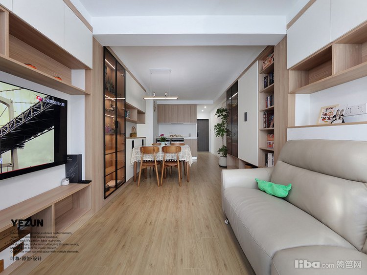 客厅布局打破常规的空间界限,把客餐厅融为一体,显得空间更宽敞。充分利用客厅的两边墙体做柜体,增加空间的储物。