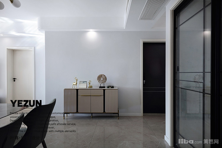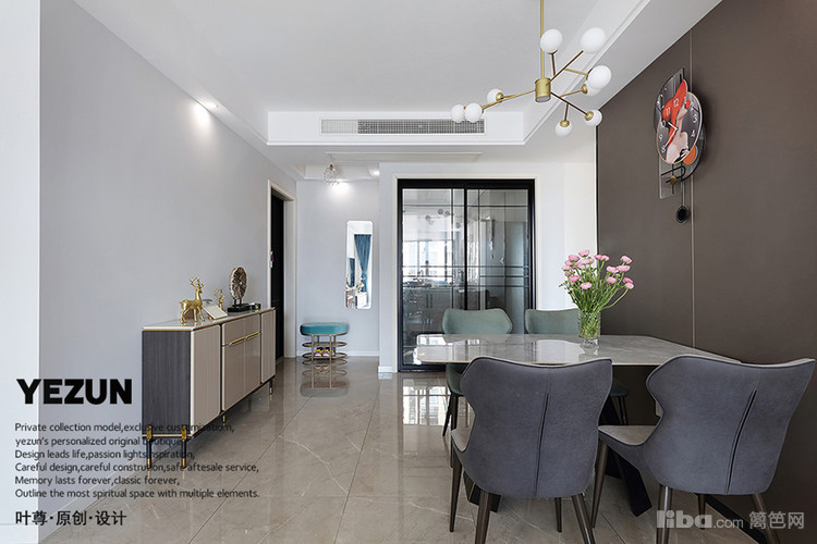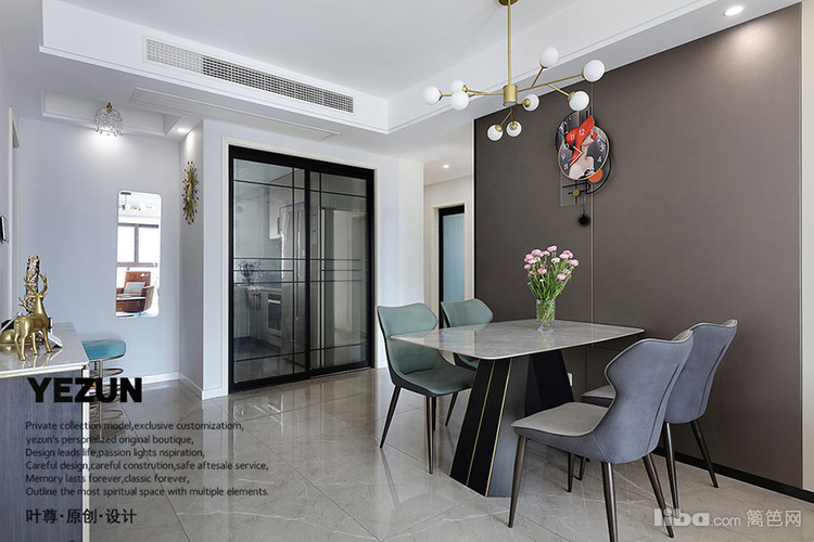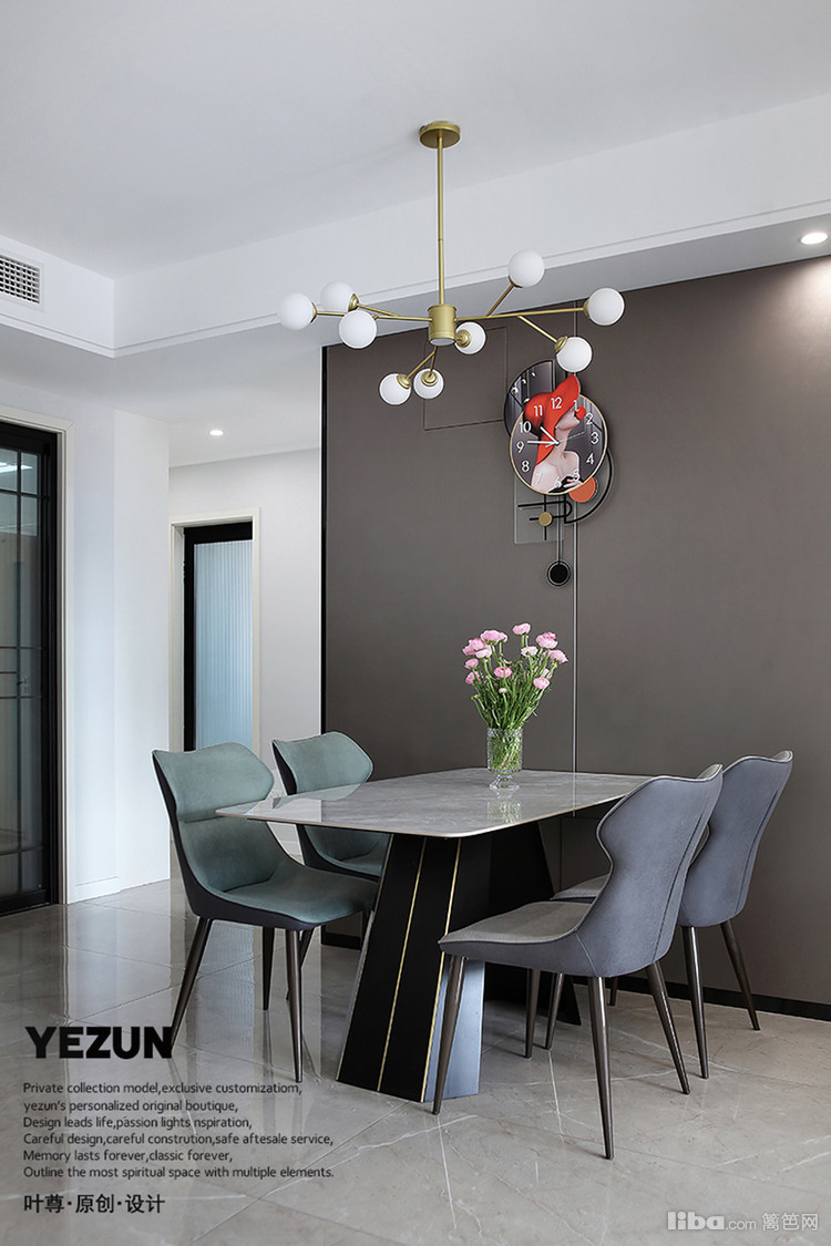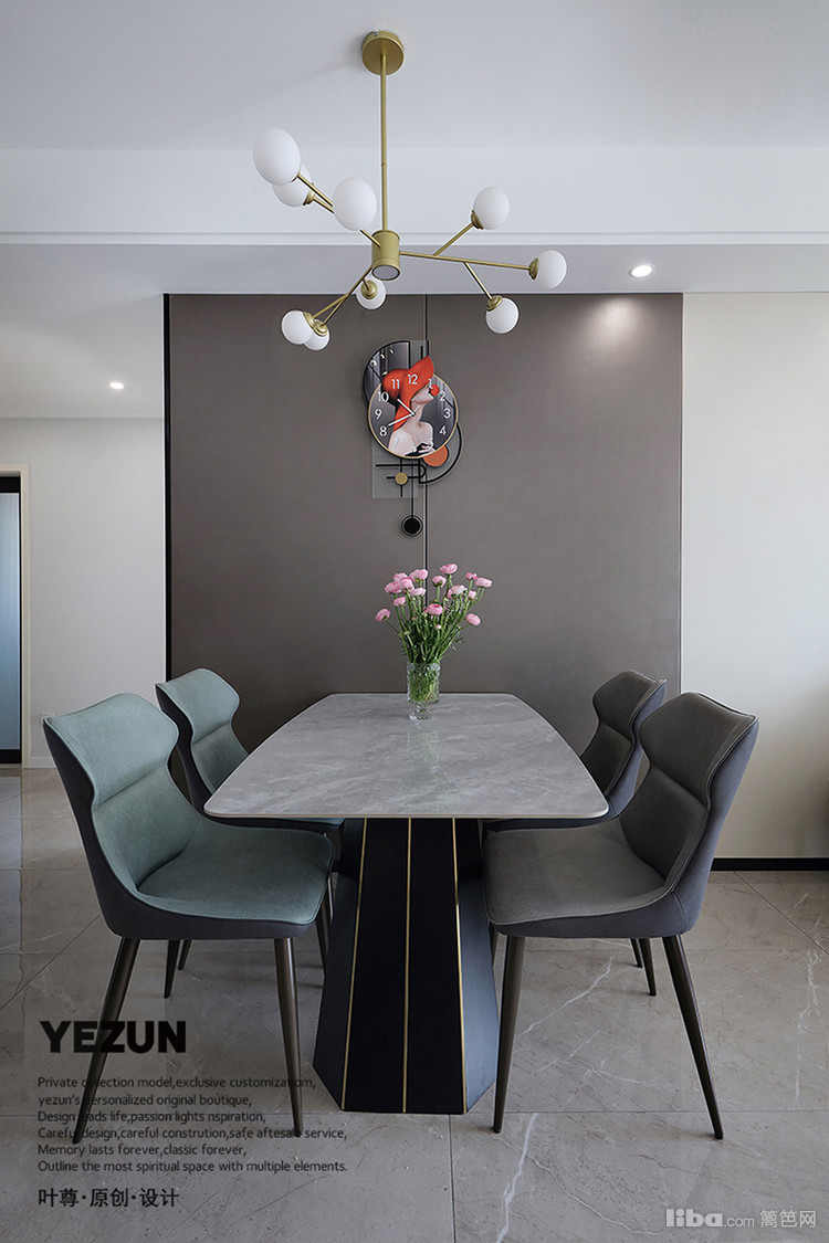 餐厅整体颜色偏深,所以利用软装处理,亮色的挂钟,白金色的吊灯,以及桌面的小摆件,在颜色的撞击上使空间更活跃。