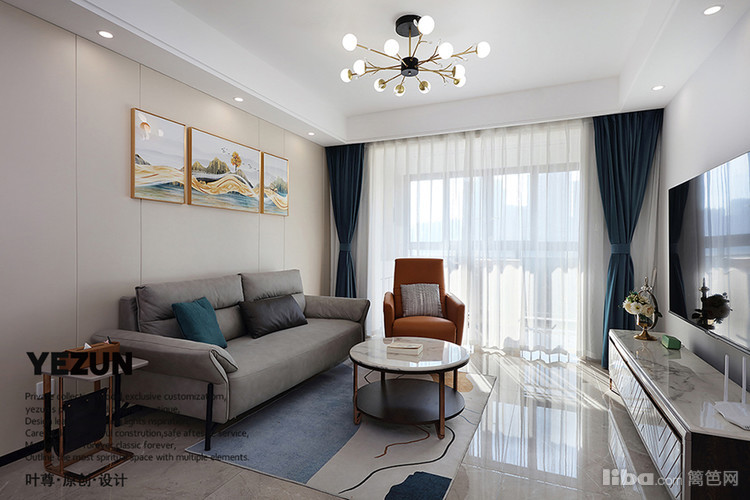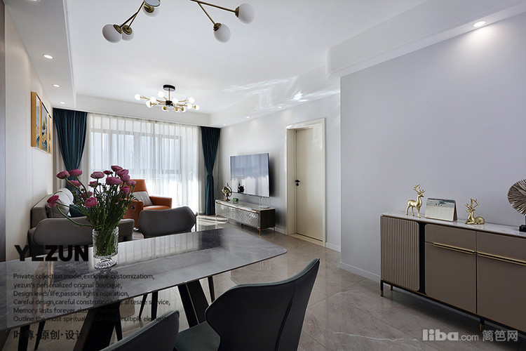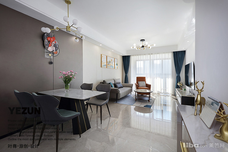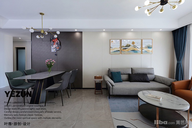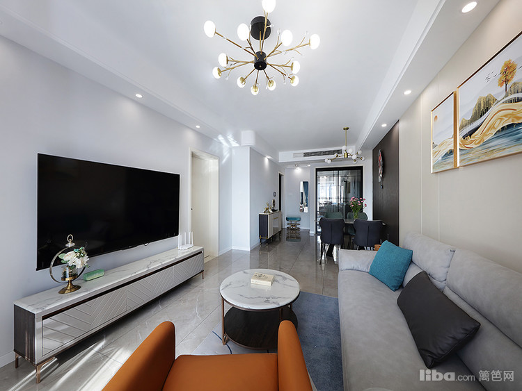 电视背景以大面浅灰色涂料为主体,拾配大理石材质家具,从而去繁为简在沙发背景的加持下使整体空间不会过于繁杂,两面能够有很好的平衡感。