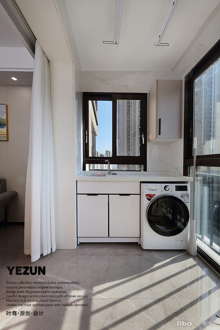 阳台保持了主要的洗晒功能,地面与客餐厅地面通铺大砖,整体空间连贯增大了客厅的视觉面积。