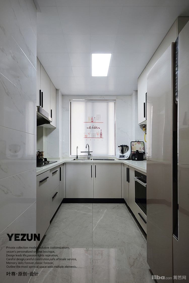 原始户型的厨房如果需要满足放置双开门冰箱,那么储物空间会损失掉非常多,所以我们将厨房外扩,拆除了原来进门正对的储物柜墙体,将厨房扩大。