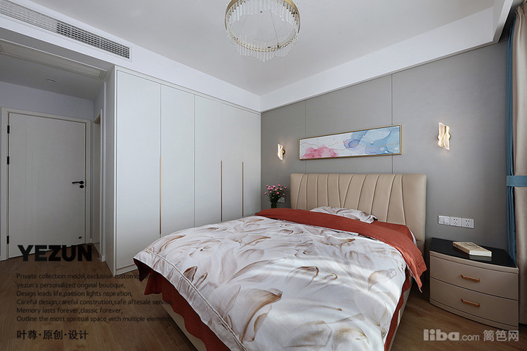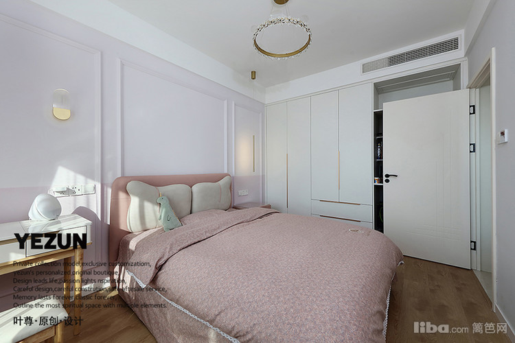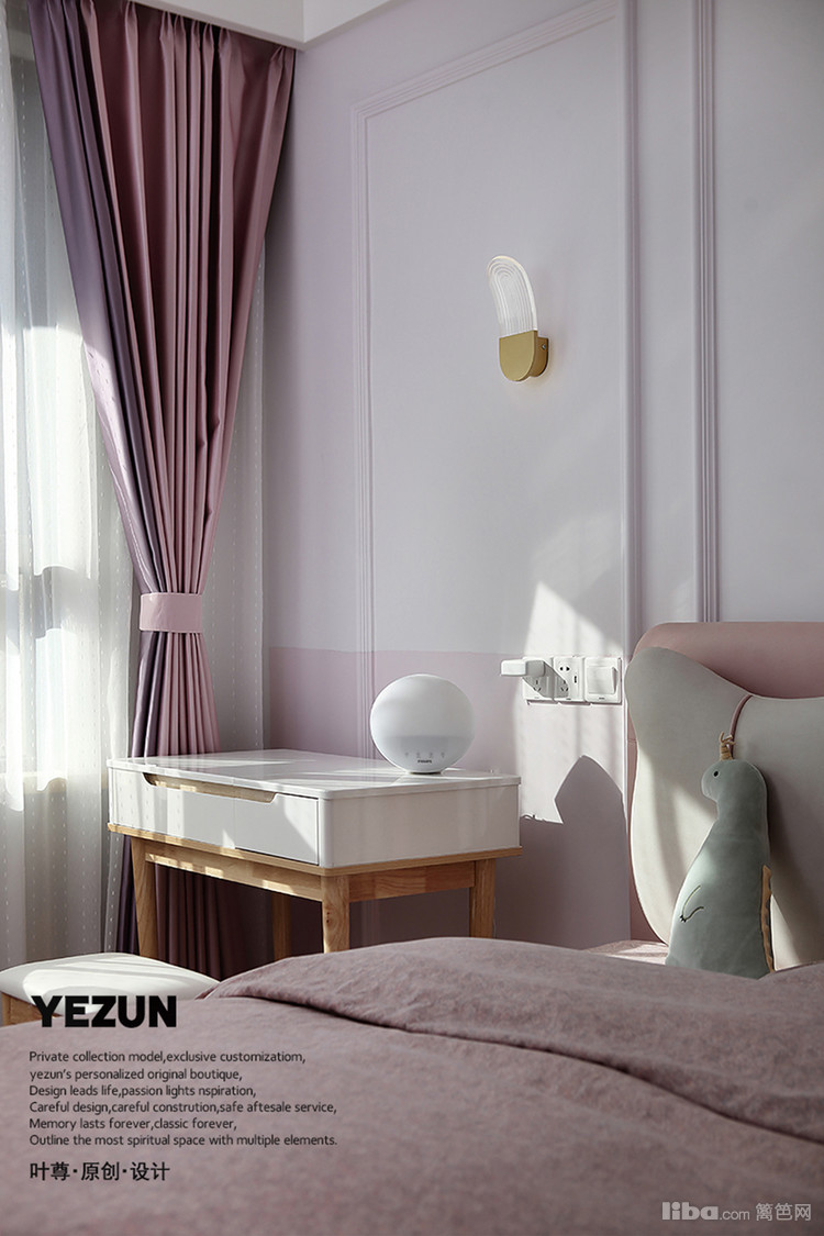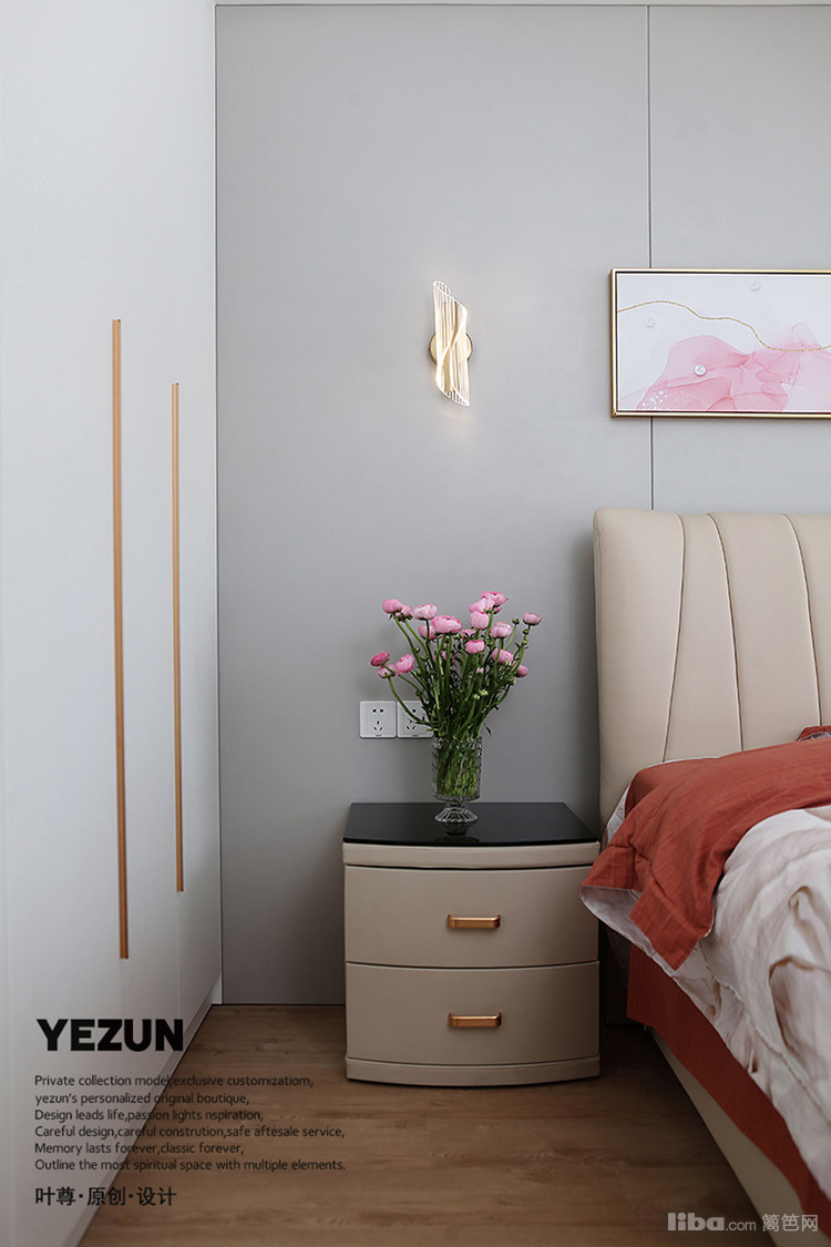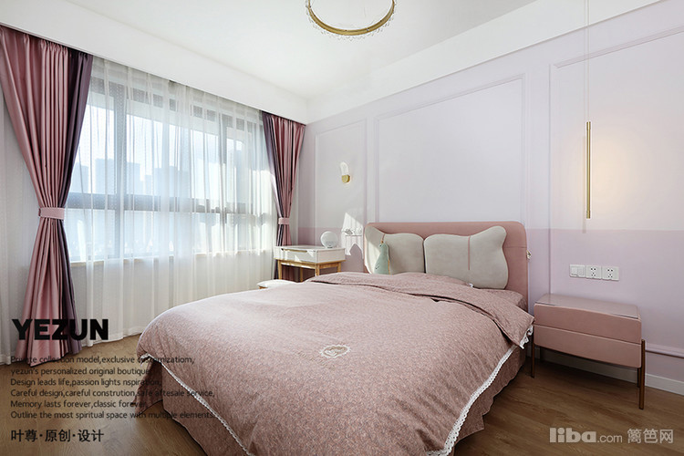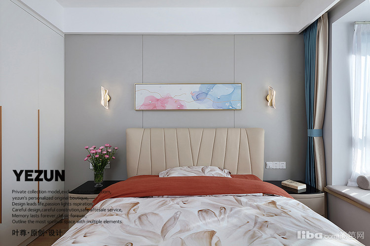 也使用了硬包背景,莫兰迪色系软装。飘窗的另外一侧设计了一面书架,可以满足日常休闲阅读。