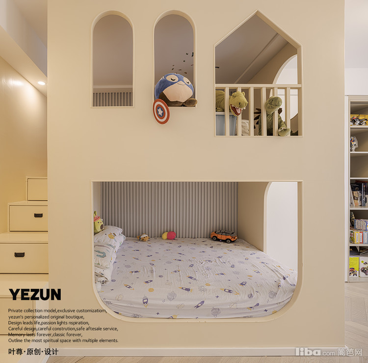儿童房的设计,现在的下层空间可以满足两个小朋友一起睡,上层空间就可以为两个男孩的游戏基地。楼梯也做成了落地式的,既能保证小朋友的上下安全性,又能当储物抽屉使用。