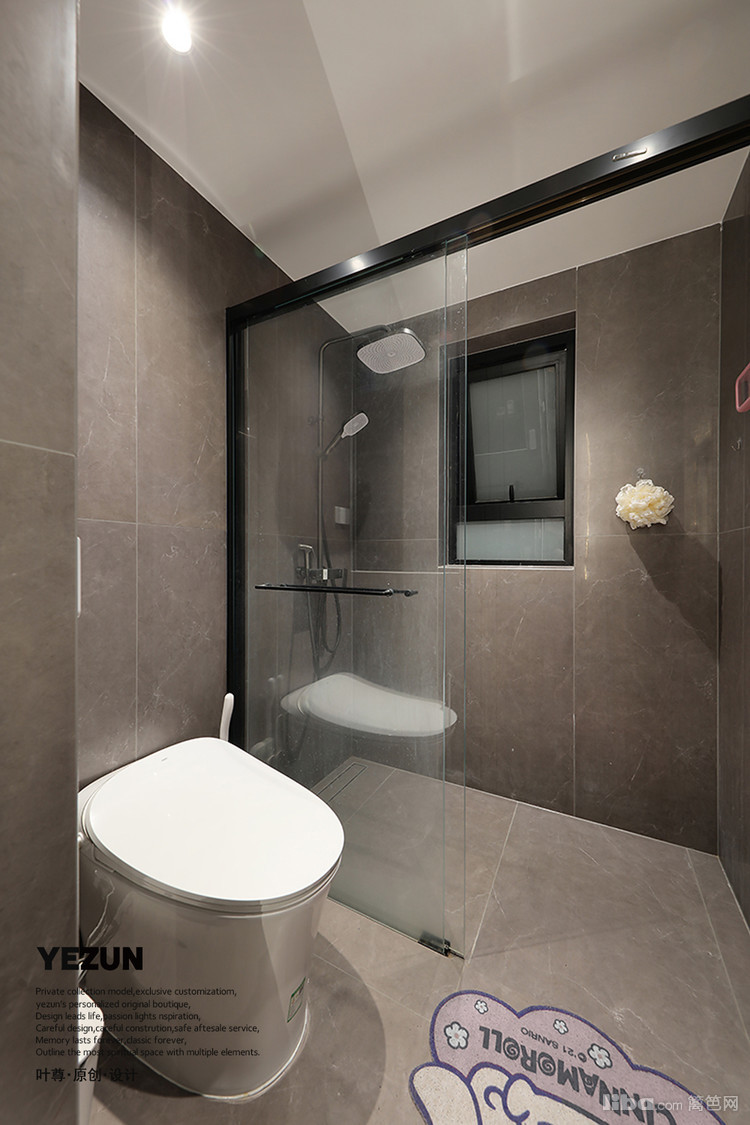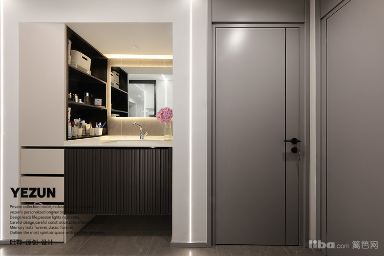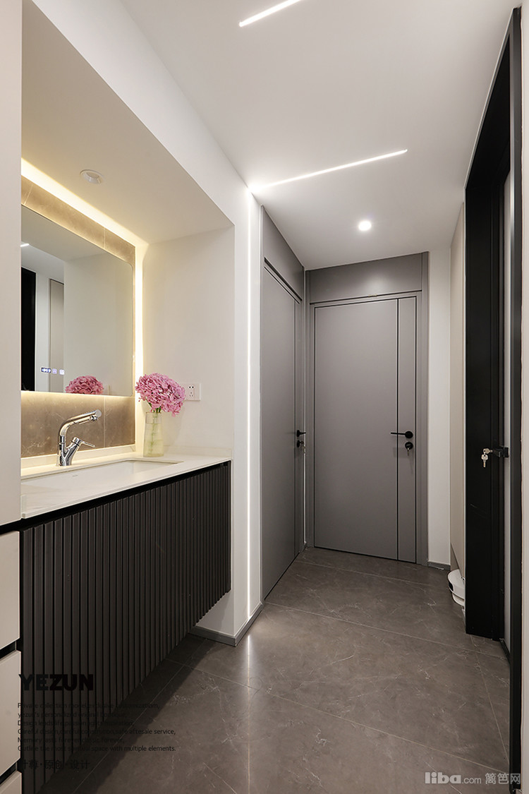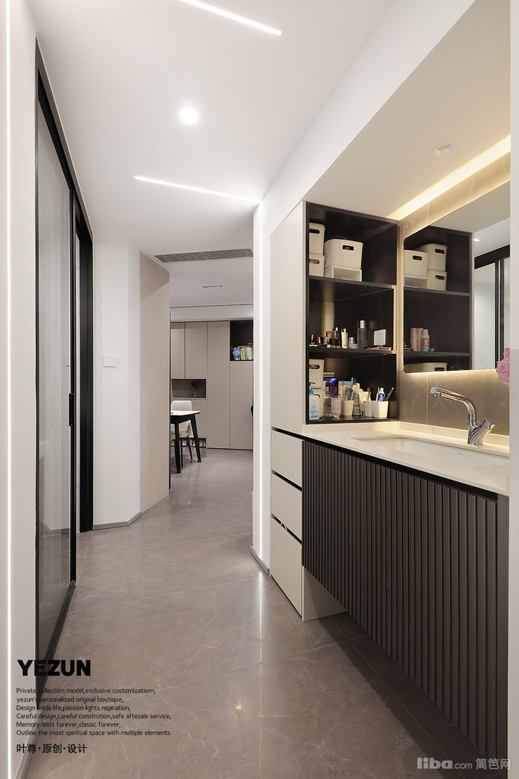 干区的镜面采用智能镜灯带,可以为梳妆补充光源。抽象纹理的大理石材质墙地一体,具备了空间的延续整体感个性的语言与情怀。