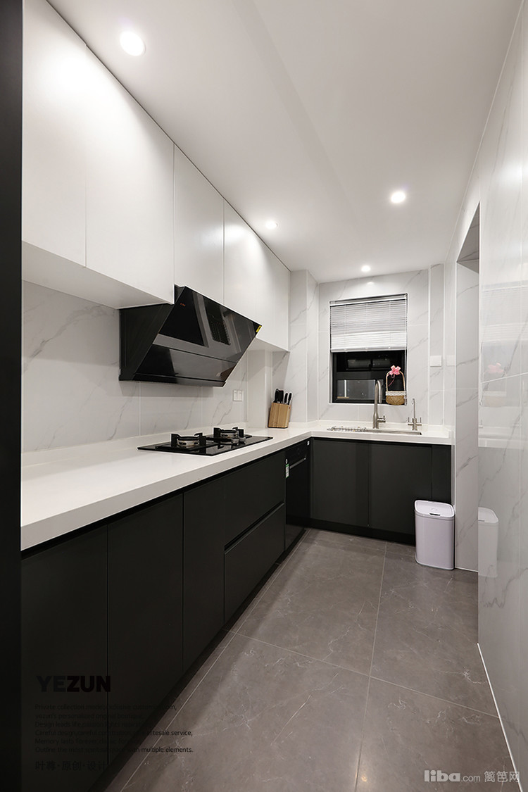 采用了高级黑与高级灰作为表现,尤其上下柜黑白的对比鲜明,给空间一种大大方方的利落感觉。常见的仿大理石瓷砖现在也一分风靡,带着积分清冷气息,增加空间的艺术质感。