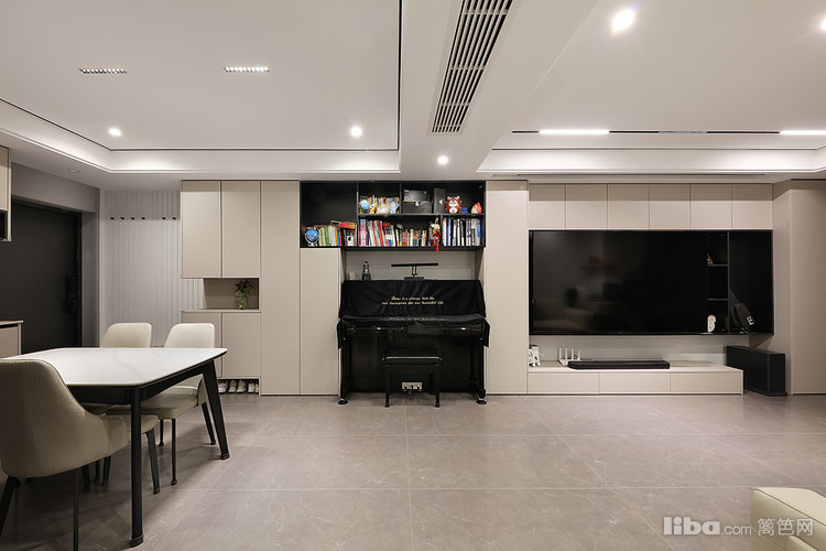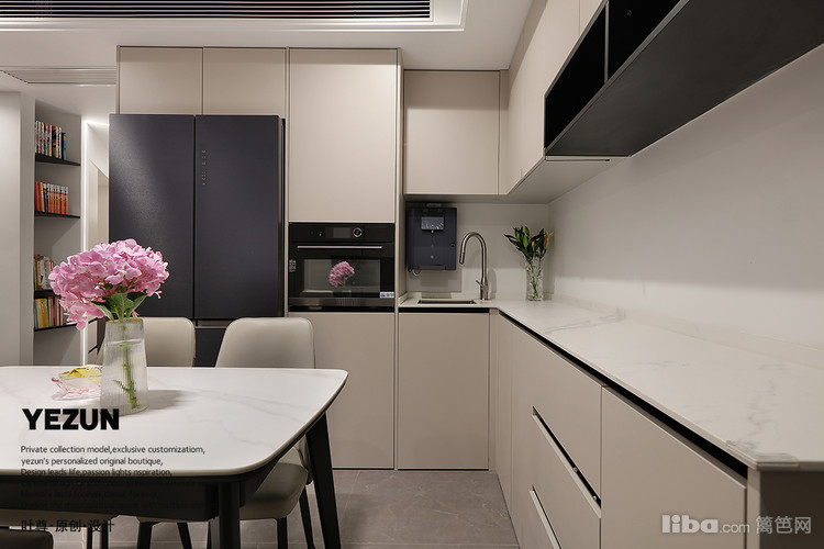 餐厅连着客厅一起,视野上显得更加宽敞。无把手设计的柜面将杂乱的一面隐藏起来,达成了空间上一致的简约美观。