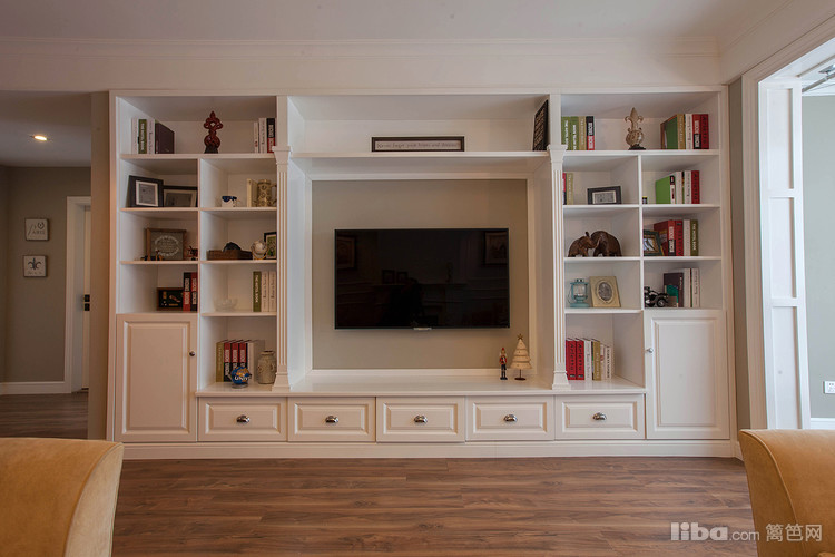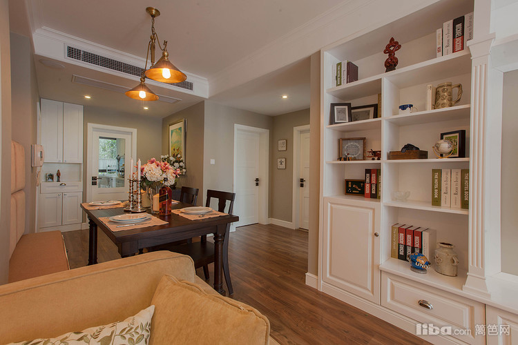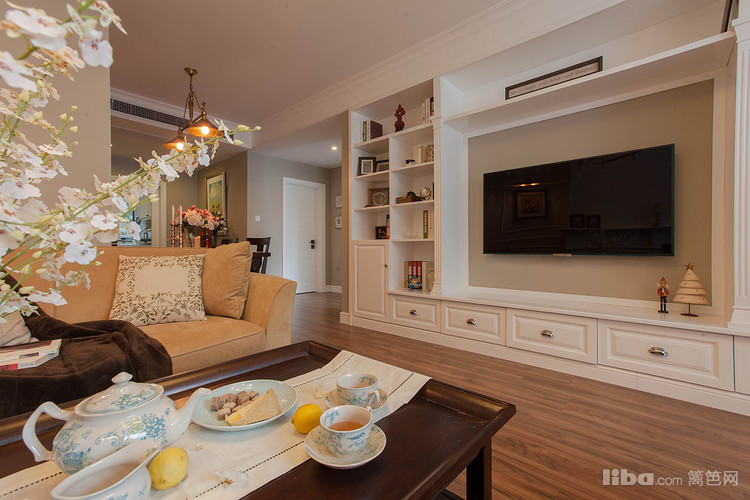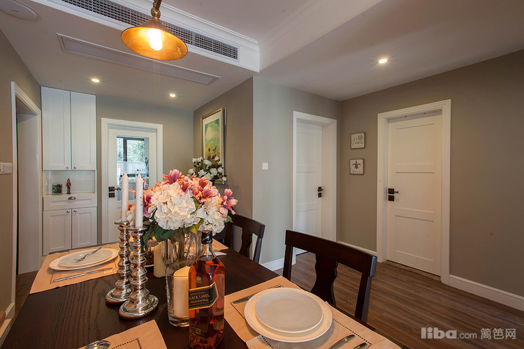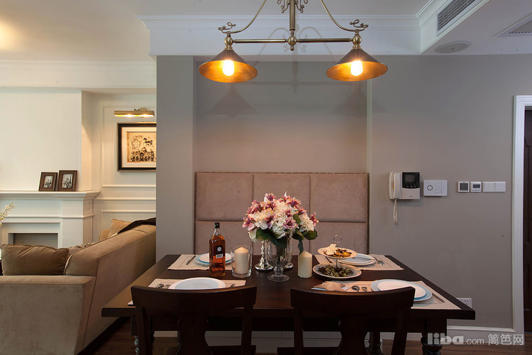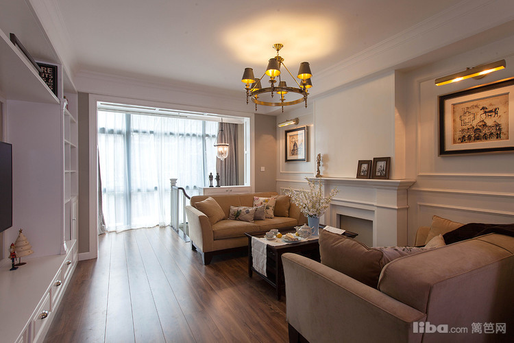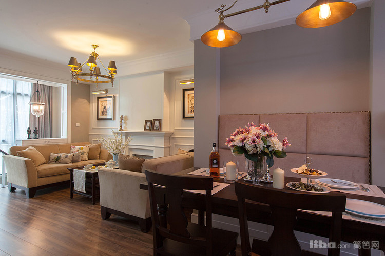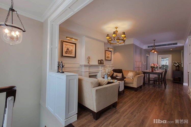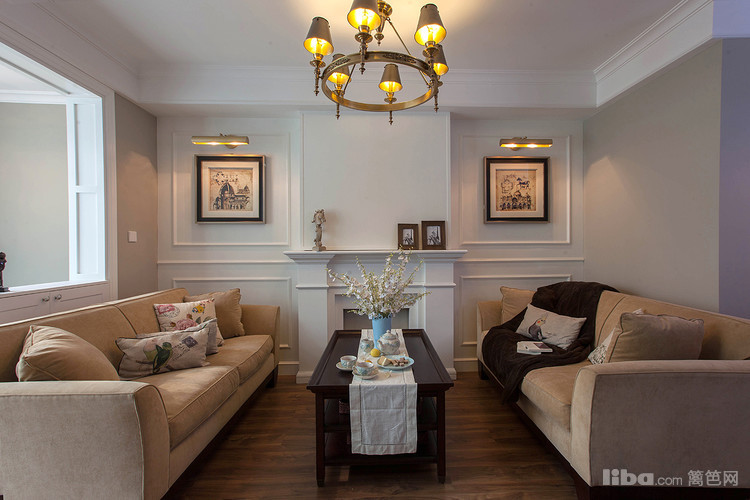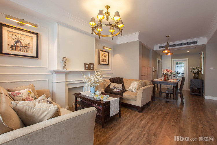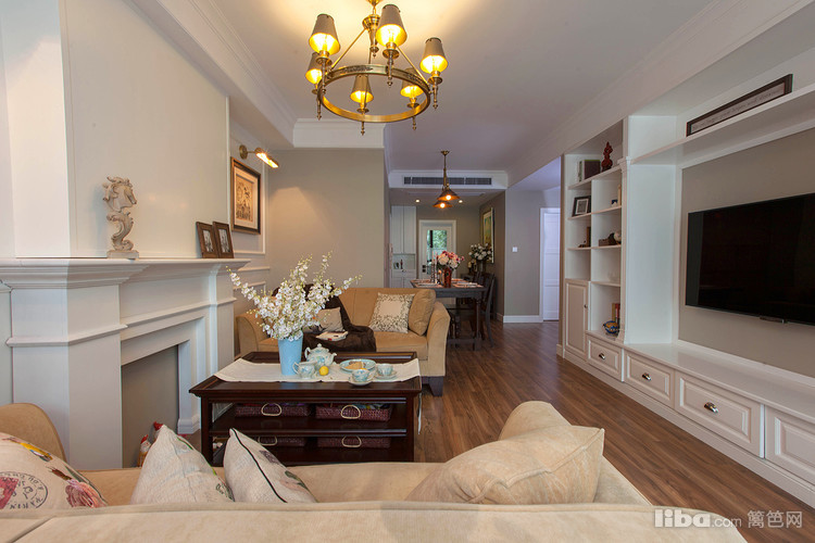 客厅吊顶简约大方,吊灯选用美式风格的吊灯。