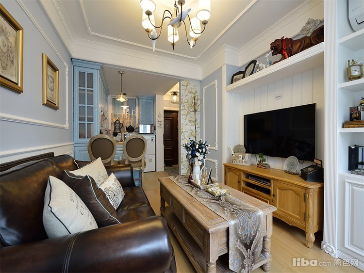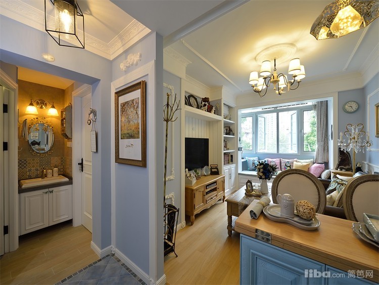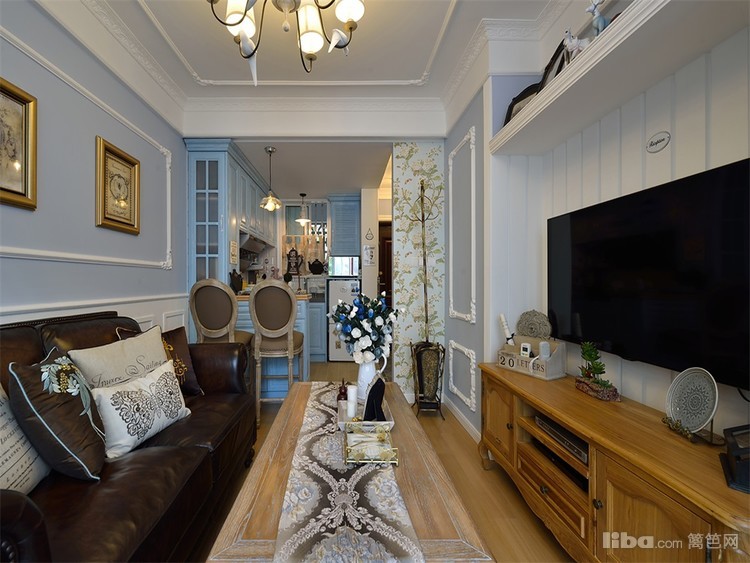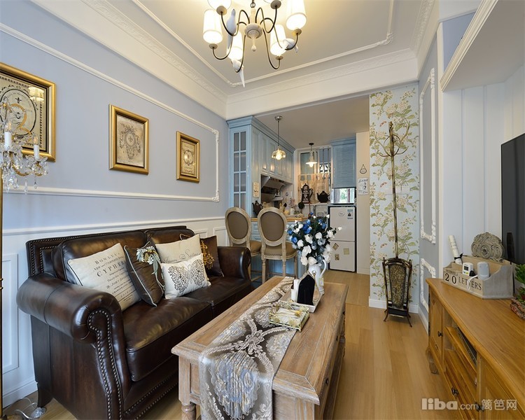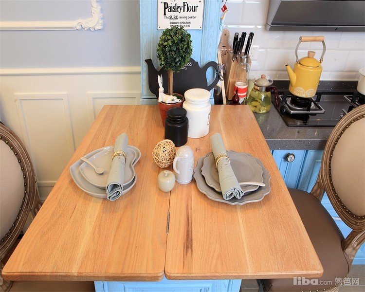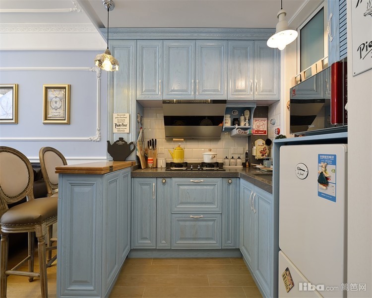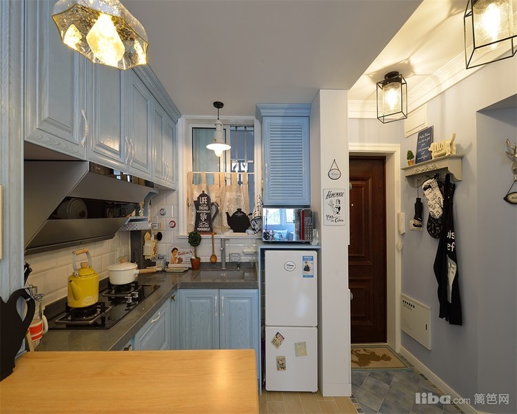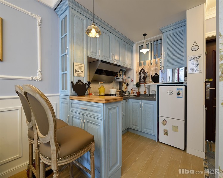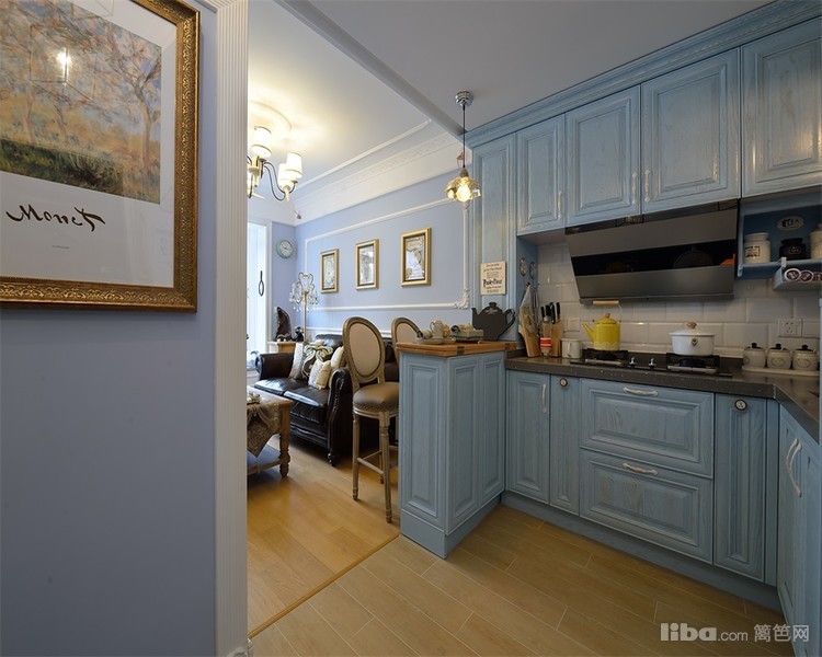 敞开式的厨房,选用淡蓝色的储物柜门。