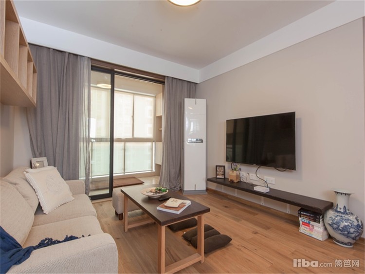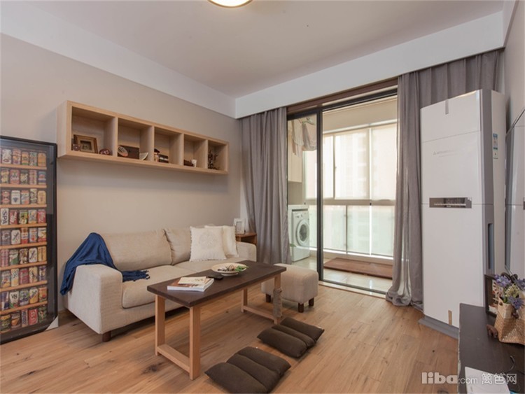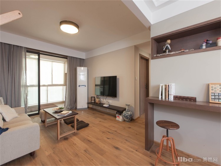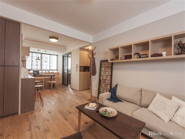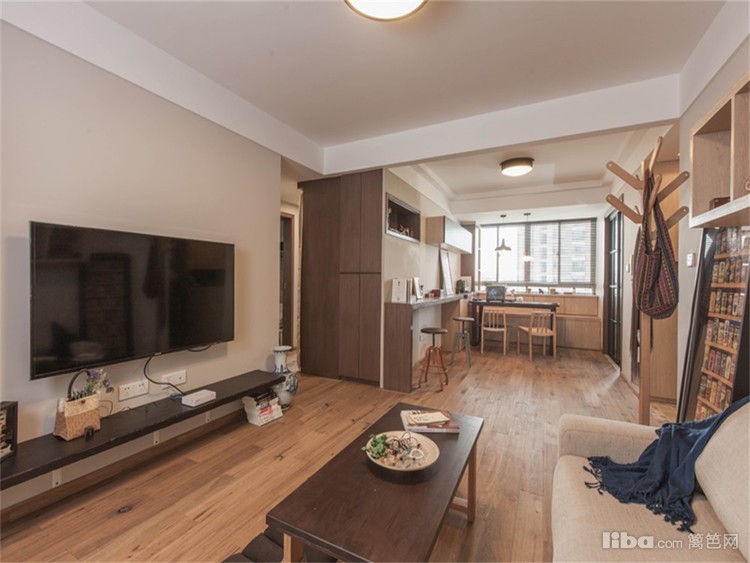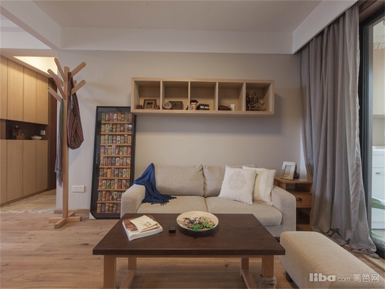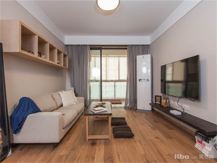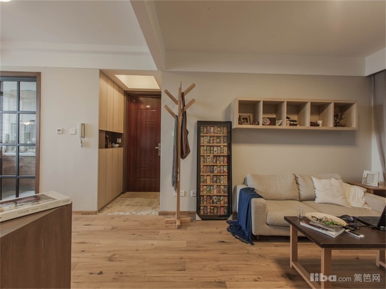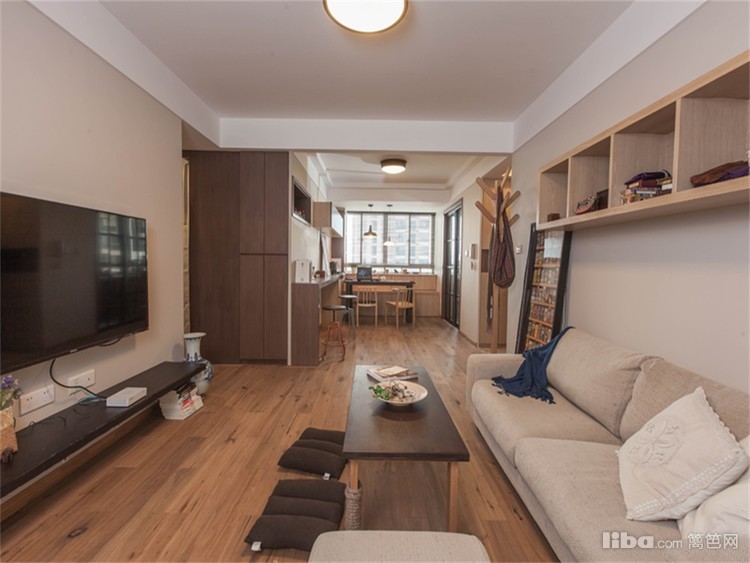 客厅的风格是原木风格,地板和储物柜选用原木色。