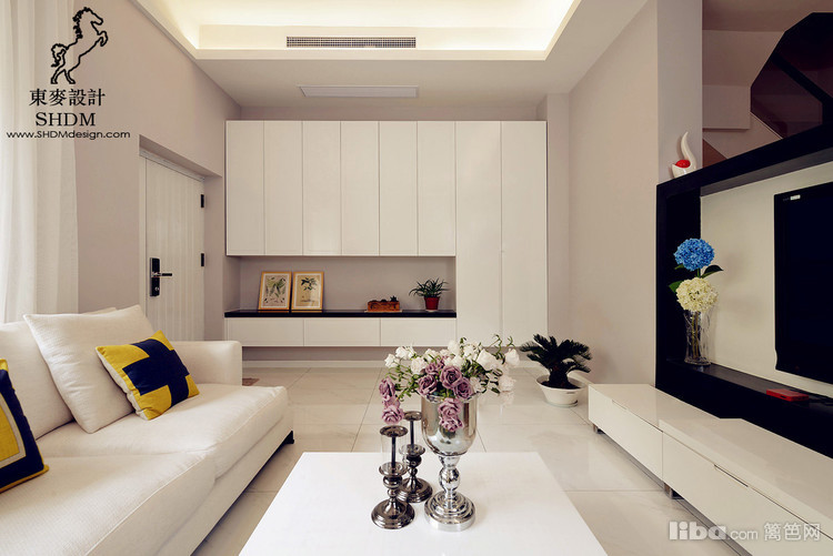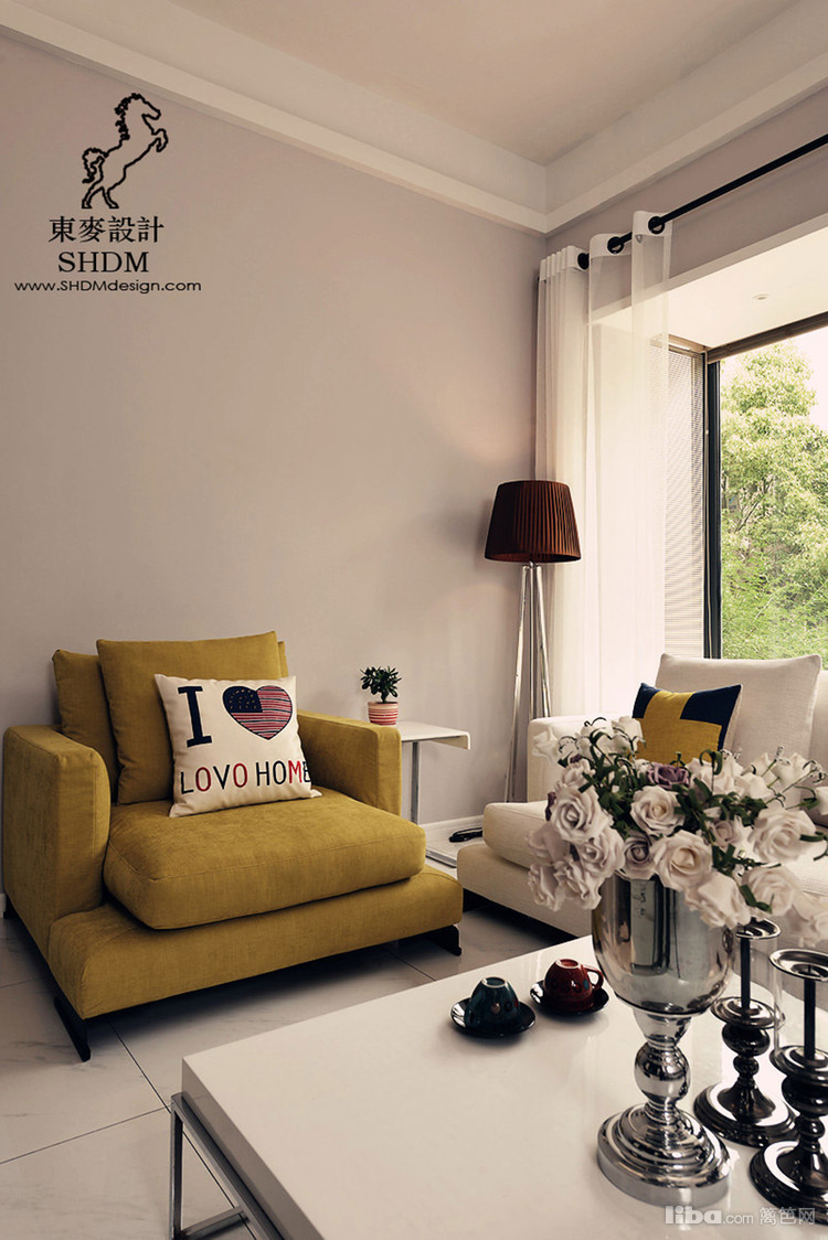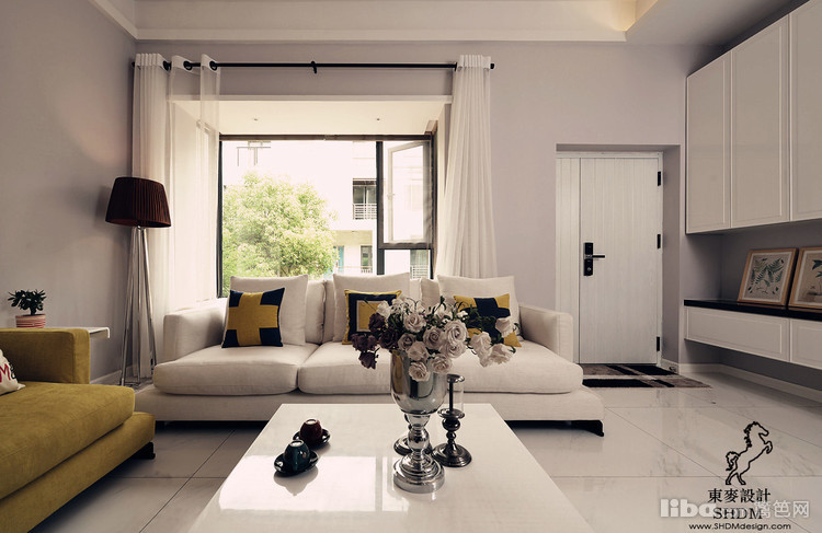 白色墙顶面为基底,柠檬色的沙发,相呼应的抱枕,一切都是干净清爽。