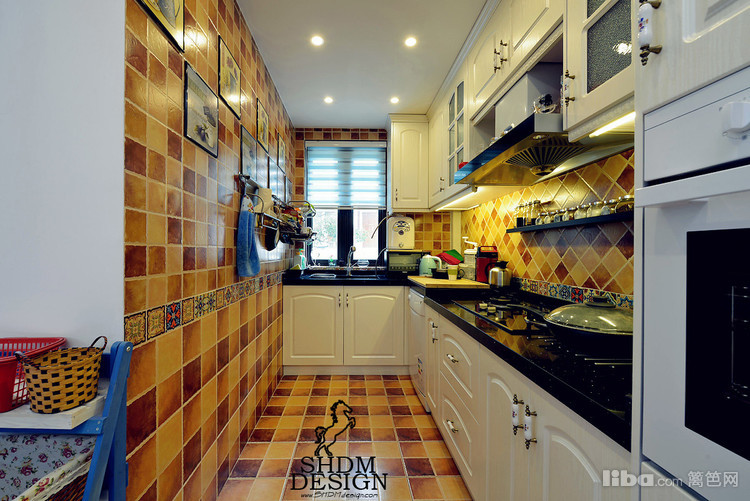 厨房墙地砖一致,连成一个整体,白色的橱柜黑色的台面,相辉映。