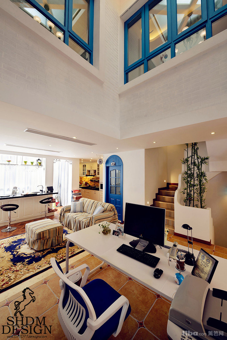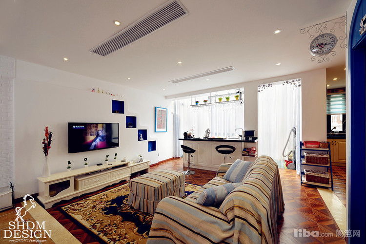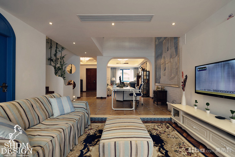 客厅以大量的纯白和蓝色相互融合。