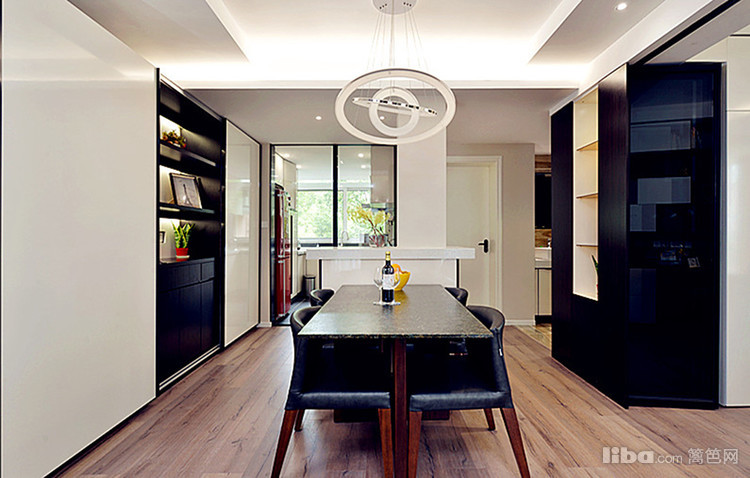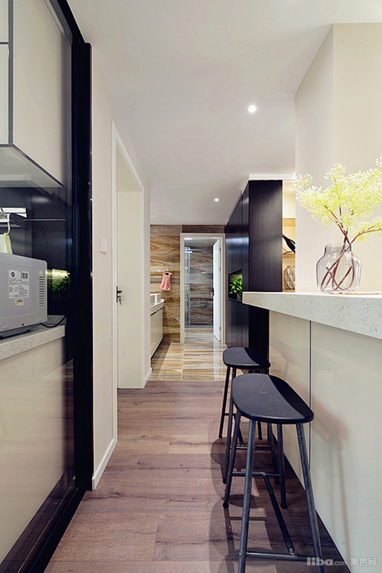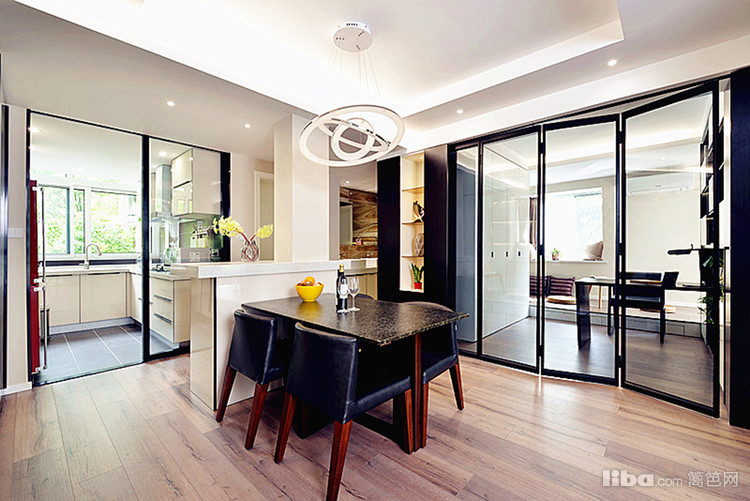 现餐厅借用了厨房一大块面积,成就了一个吧台和储物柜,也成就了明亮的餐厅。