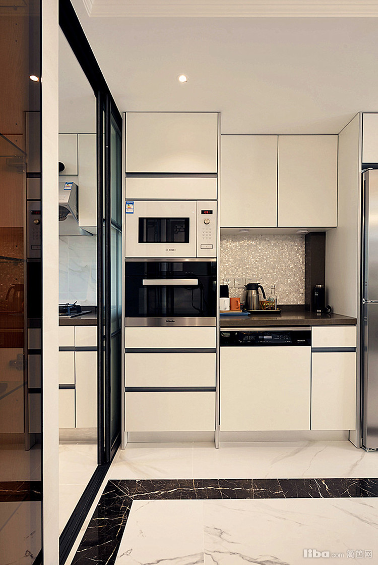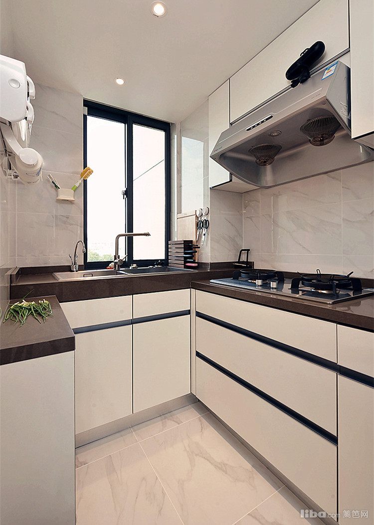 订制的白色橱柜,厨房空间小,光照不足,所以用色均以浅色为主。