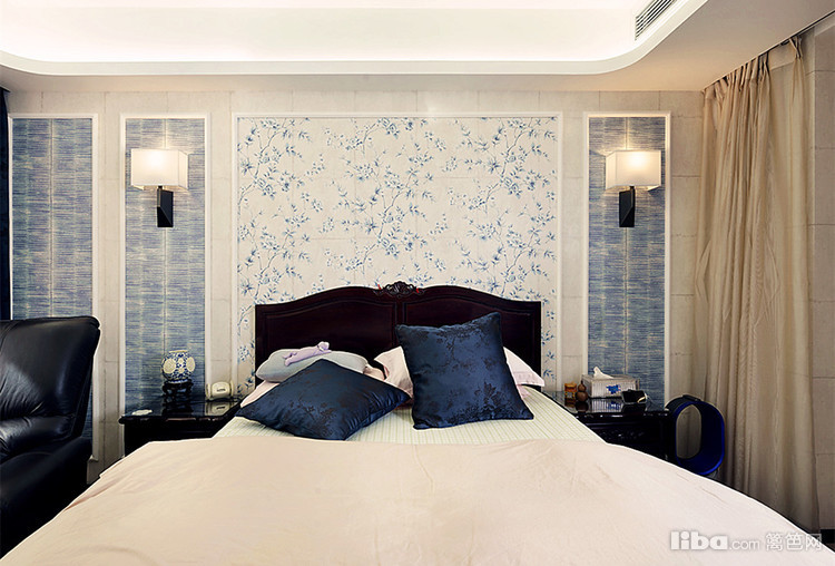主卧里均以浅色为主,背景的蓝色与床上抱枕相呼应。
