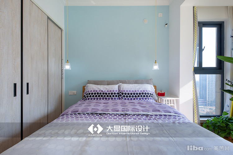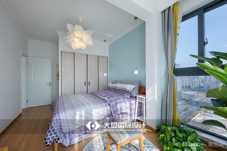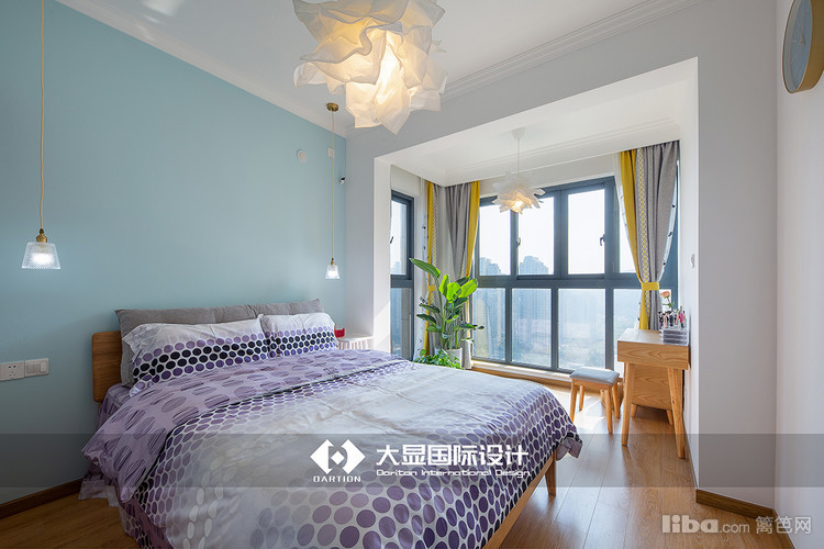 蓝色的背景墙搭配淡紫色的床品,安静又梦幻,灰色蓝色的双层窗帘点缀的恰到好处,卧室与阳台要绽放的花朵样式吊灯,与客厅的花瓣吊灯、餐厅的花苞吊灯相呼应。