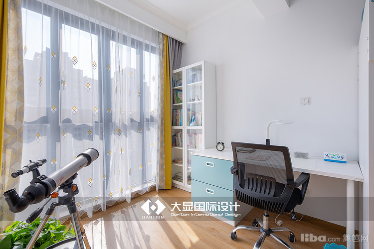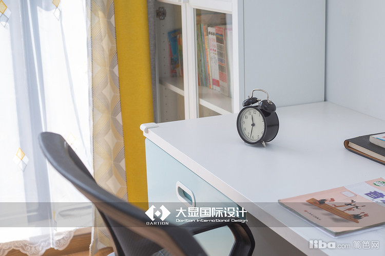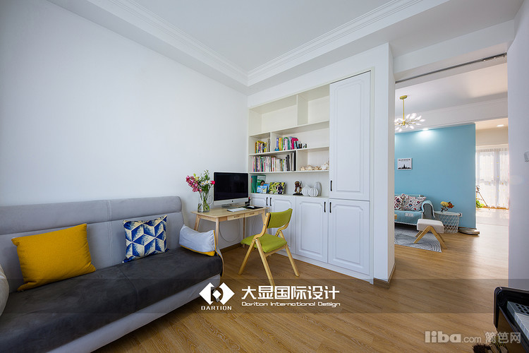 客厅一侧设计有办公桌,在光线充足的地方工作,心情也活很好,书桌一侧是书架,平时取一本书坐在沙发上或者摇椅上,趁着阳光正好,无比惬意。
