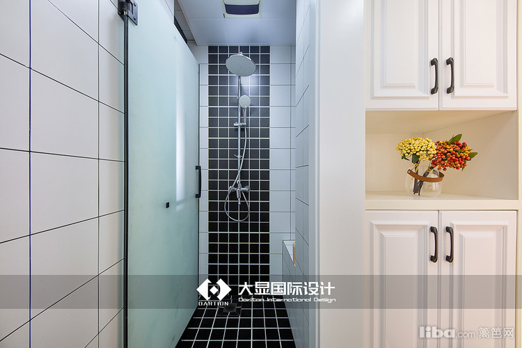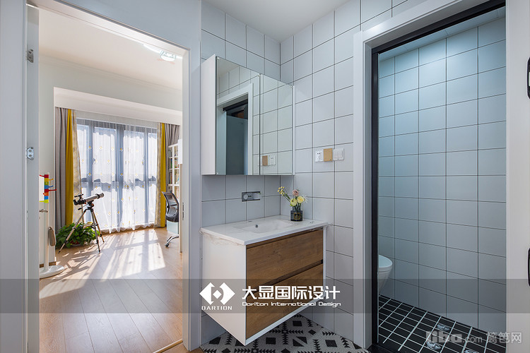 卫生间干湿分离,以花色砖区分开其他空间与洗漱台,又用黑色格子砖与花色砖区分开洗漱和淋浴区,使用玻璃移门,既节省空间,又防止发生意外外侧无法打开耽误时间。