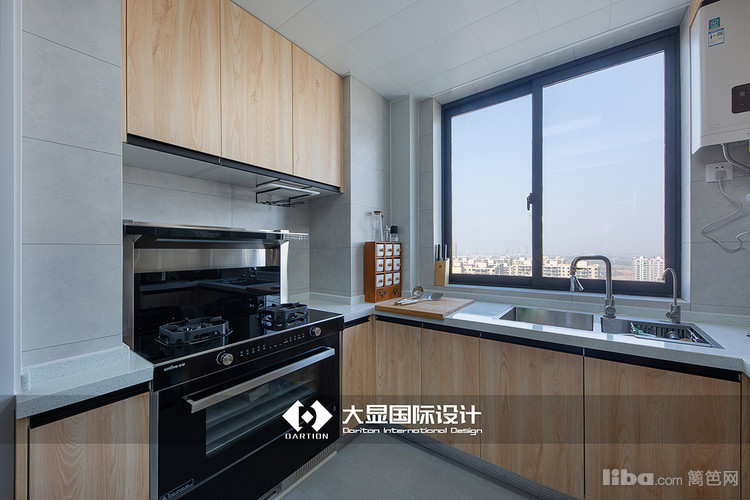 调味品被放置在分类储物盒内,案板就在窗口,紧邻洗水池,水龙头为抽拉式龙头,另一个就是洗碗机