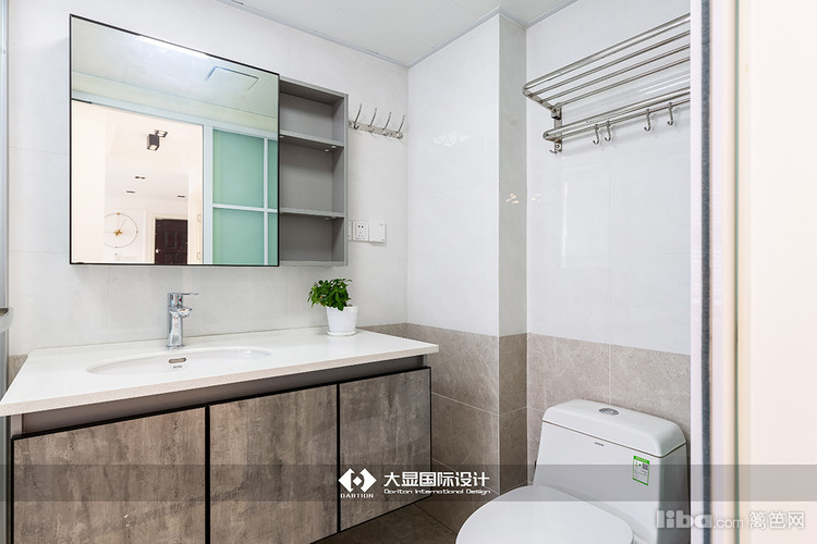 卫生间采用两种颜色分割上下,柜子的颜色和墙面下部分颜色一样,而且高度也一致看起来比较整齐。