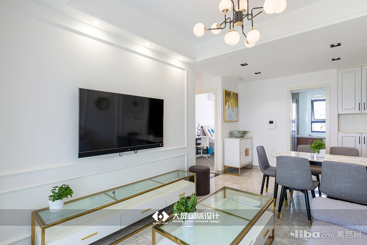 墙上的装饰画和时钟以及客厅的茶几和电视柜带有金属色,给人以轻奢感。