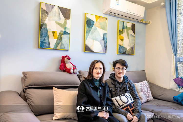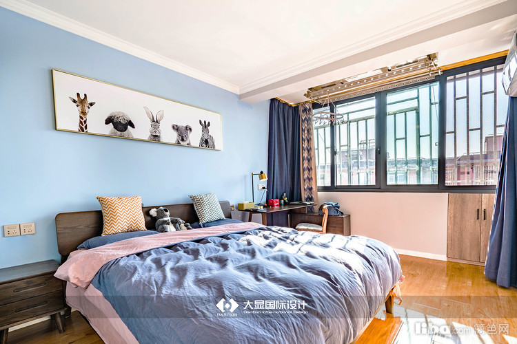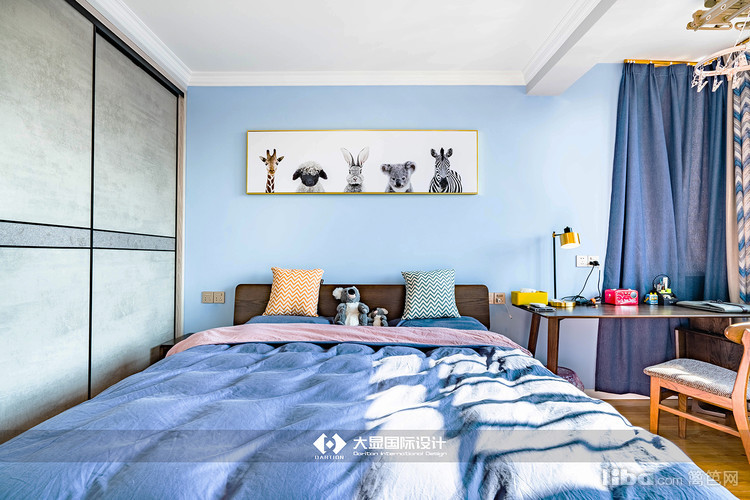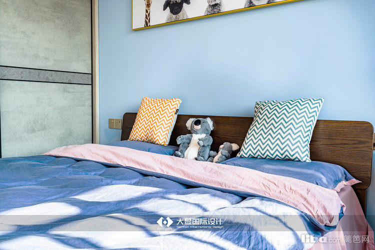 卧室整体为蓝色,给人以安静的感觉,能够在休息时更好地沉下心入睡,业主比较喜欢考拉,所以在卧室摆放有考拉玩偶。