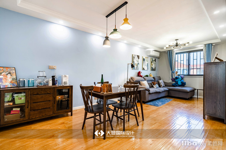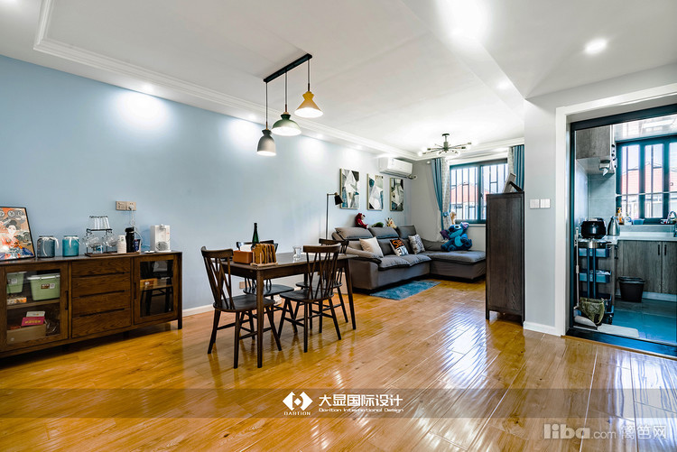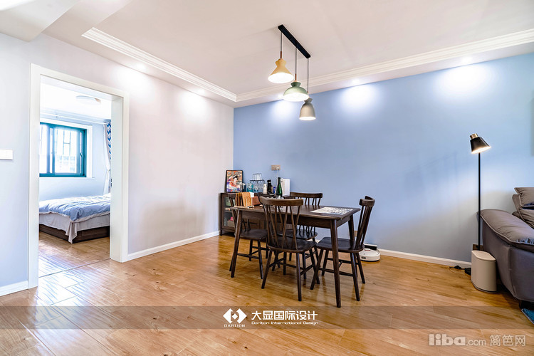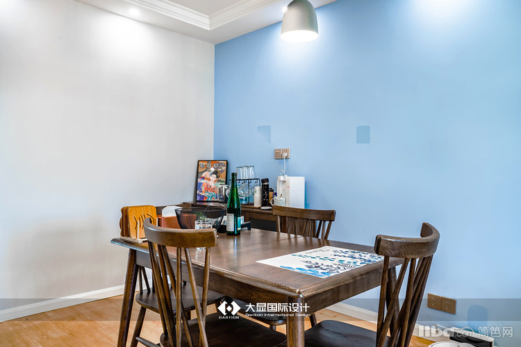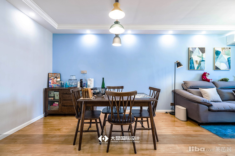 客厅与餐厅以蓝色背景结合,又以蓝色地毯区分界限,风格明显又不重复
