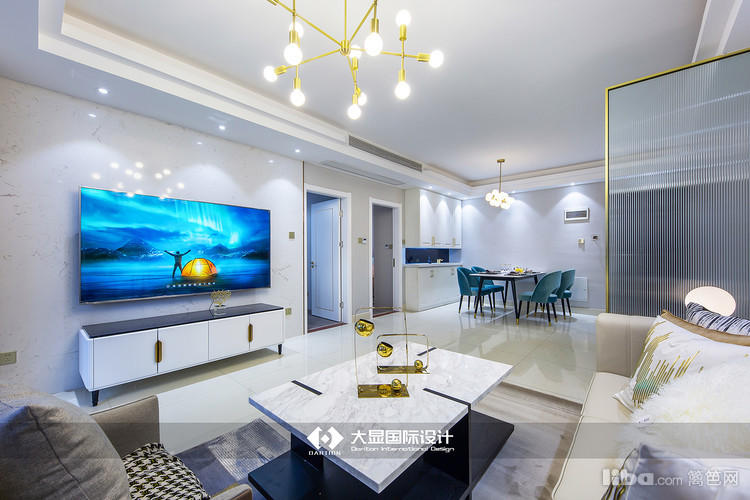 客餐厅整体为黑白灰点缀以金色,带有一丝轻熟的气质,客餐厅吊顶没有分开做,从一侧看去空间显得很大
