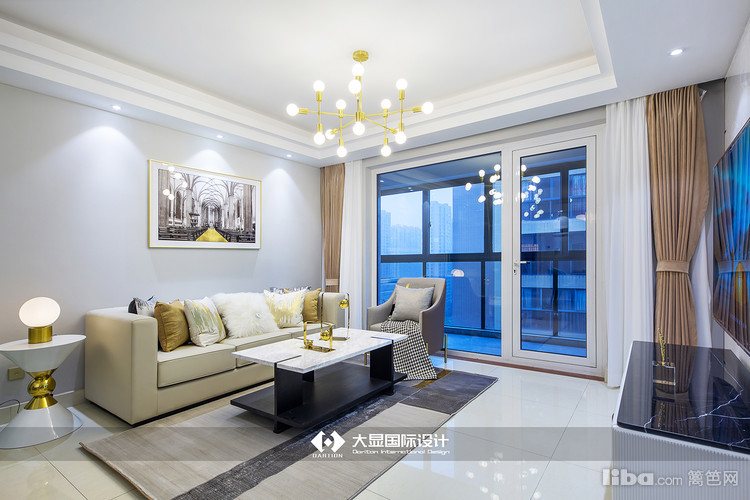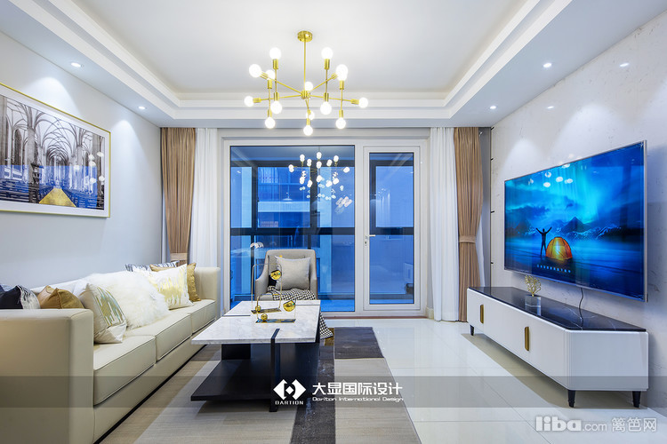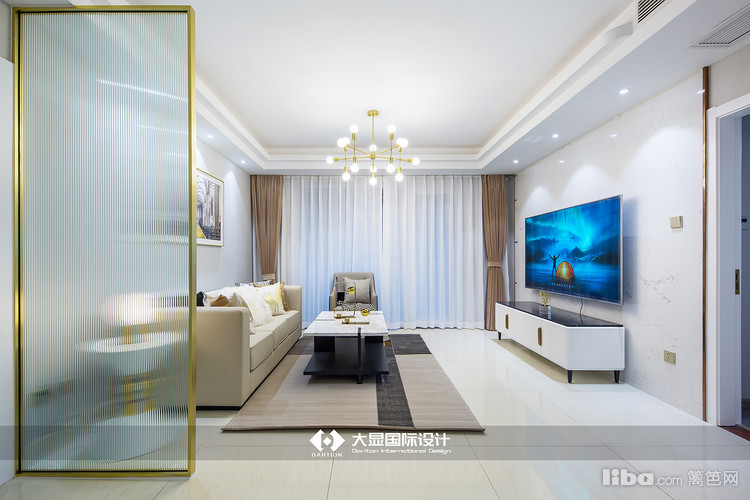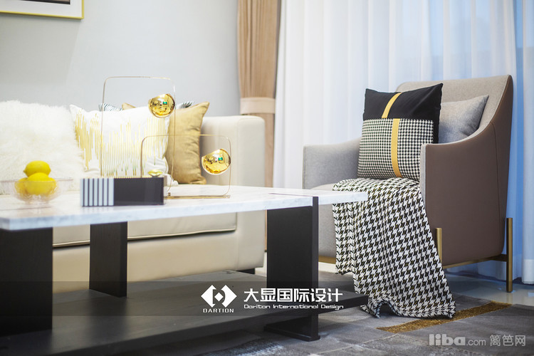 黑白的电视机柜和桌子,白墙,浅色的沙发,灰色的单人椅,整体简洁明亮,但是又在各处点缀以金属色
