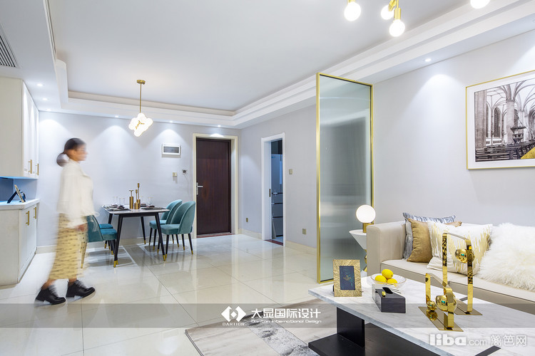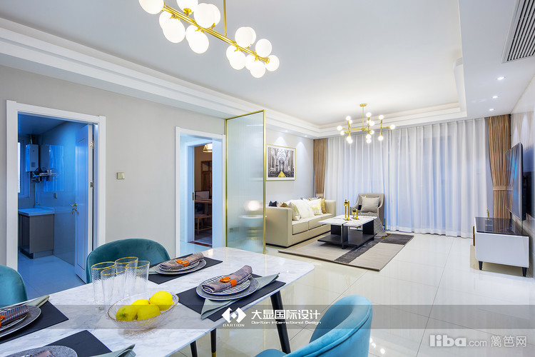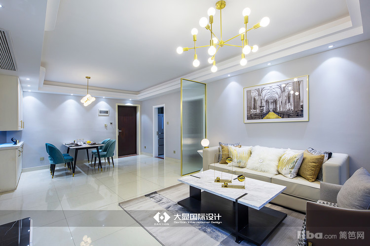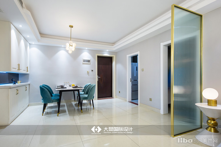 客厅餐厅之间没有什么阻碍,做了一个开放式客餐厅,这样可以让光从客厅经过,投在餐厅,又因为进门不见厅的原因,在客厅这里设计了一个简易屏风,说是简易屏风,但是又因为金属边框而显得华丽。
