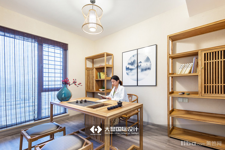 木色与墙上的水墨画相映衬,沏一壶茶,嗅一枝花,在茶香之中领略禅意。