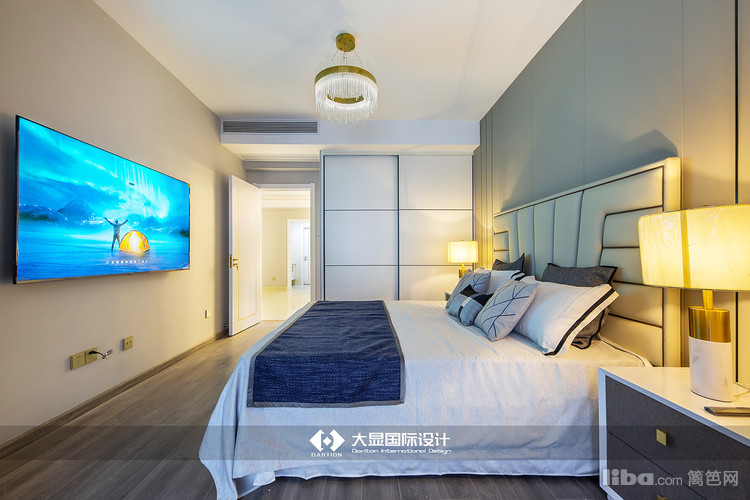 主卧整体安静而温馨,并没有做太多的繁琐的设计,只是从色彩搭配和灯光设计上就营造出一种温暖的氛围,床头灯和吊灯的金属元素又给主卧增添一些奢华的气息。