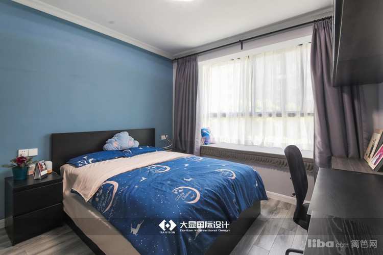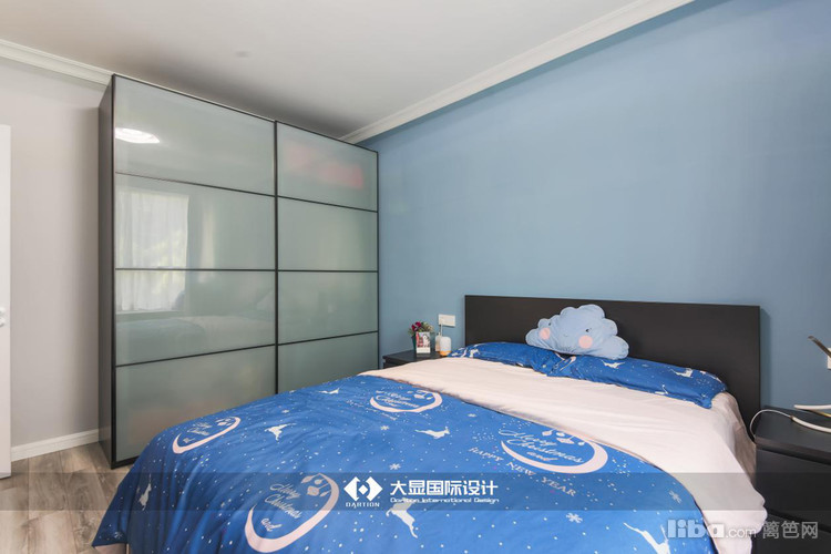业主夫妻都很喜欢蓝色,墙壁的颜色是灰蓝色,星空蓝的被子和枕头以及靠枕,地板使用仿木纹复合地板。