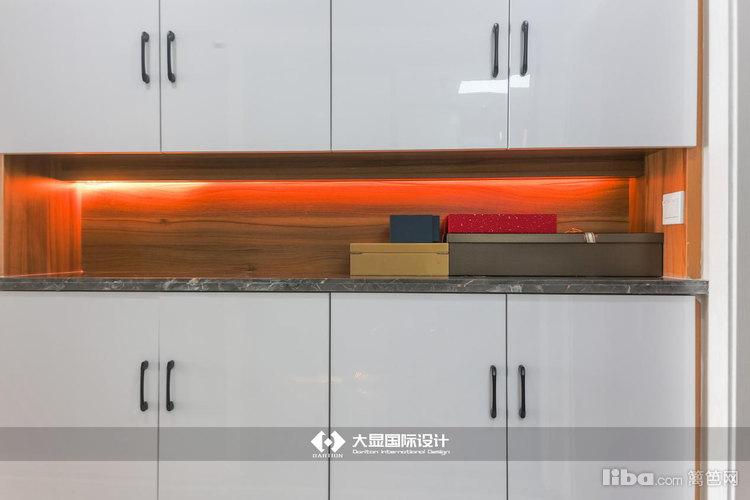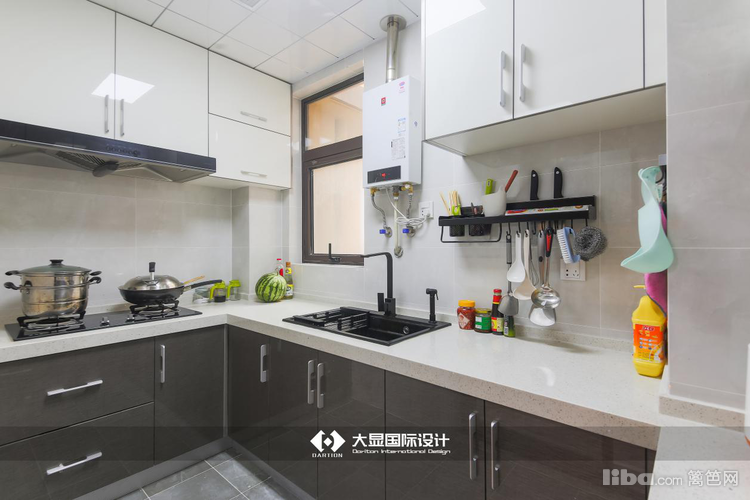 。上面的吊柜为白色,下面的柜子为棕色,让人感觉重心在下,不会感到压抑.
