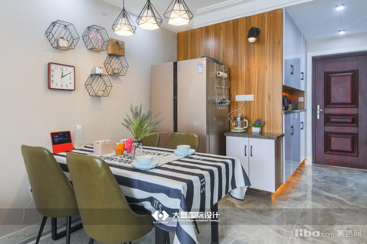 餐厅用了黑白条纹的餐桌布,有一种简洁的时尚感,座椅依旧是皮质座椅,业主家中大多是皮质座椅,因为孩子还小,怕他磕磕碰碰,也不想因为孩子调皮而天天麻烦的清洗,皮质的座椅方便清理。