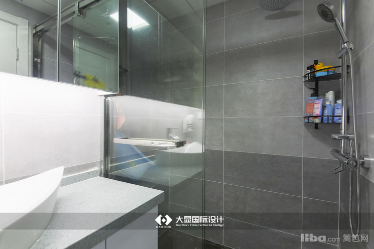 洗手间这里在马桶那里采用了一面墙使的几何图案,看上去有立体感,实际是很平整的。其他墙壁使用带有工业风的水泥灰瓷砖。