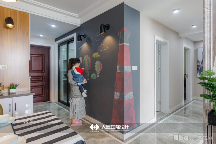 设计师特意设计一面黑板漆的墙壁,业主家的孩子喜欢画画,这样可以在这面墙壁上画画,清洁用湿抹布擦拭即可