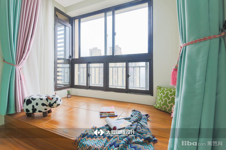 儿童房目前还只是孩子的娱乐场所,粉色和绿色的清新的窗帘,设计师设计了榻榻米,因为孩子大多喜欢就地而坐