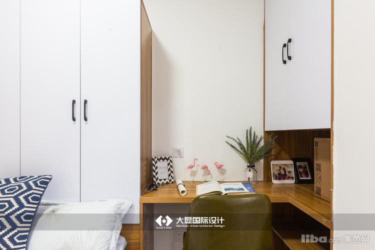 两米的宽度,留有30cm设计了衣柜。一侧设计了写字桌,拐角处还可以摆放书籍