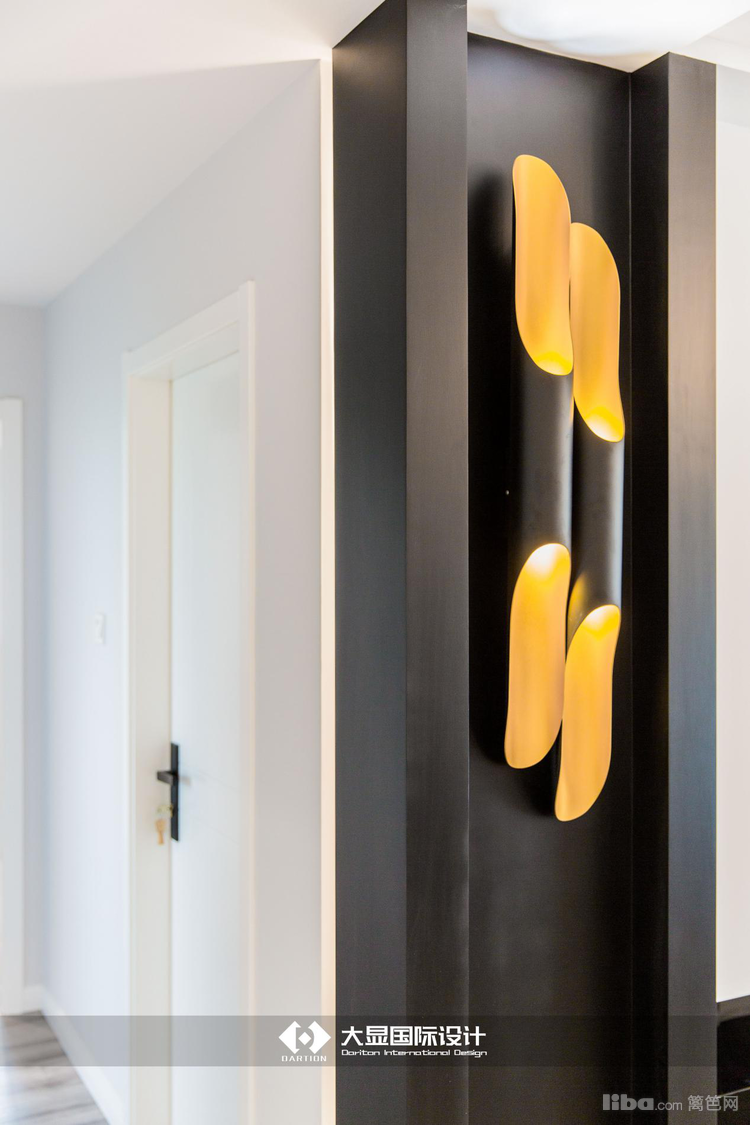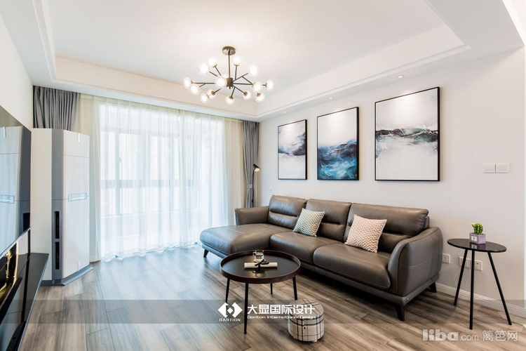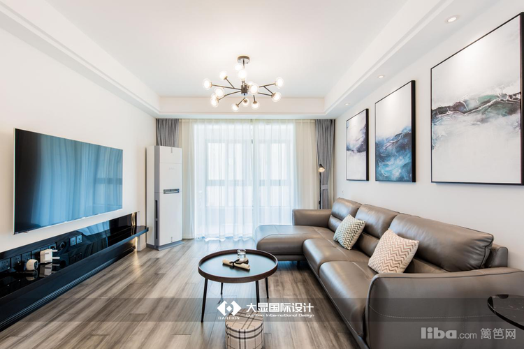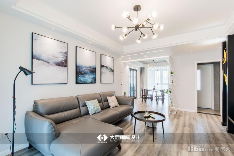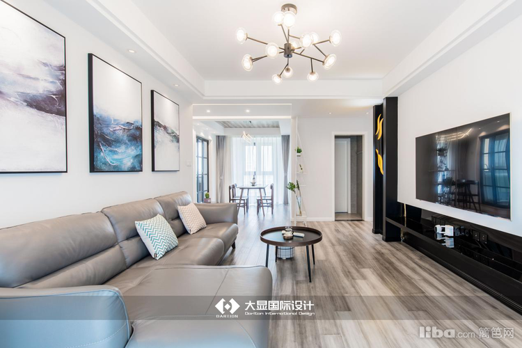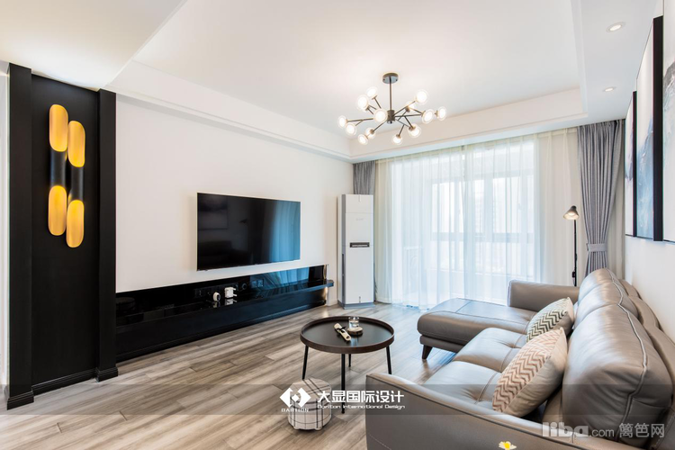 客厅整体为黑白灰的搭配,除黑白灰以外,棕色是主要色调,占色彩比重的百分之七十,而蓝色壁画,占色彩的百分之二十,而点缀色是艺术灯占比重百分之十,这种经典搭配法,让空间变得 更加协调。